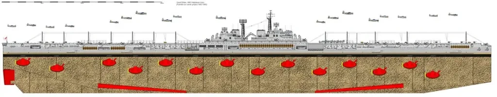 На борту этого суперавианосца предполагалось разместить 6 бомбардировщиков Vickers Wellington GR, 120 истребителей-бомбардировщиков De Haviland Mosquito FB и 200 истребителей Supermarine Seafire. Для обслуживания такой армады служили четыре двухпалубных ангара, подъемники для самолетов и боеприпасов и другое оборудование.