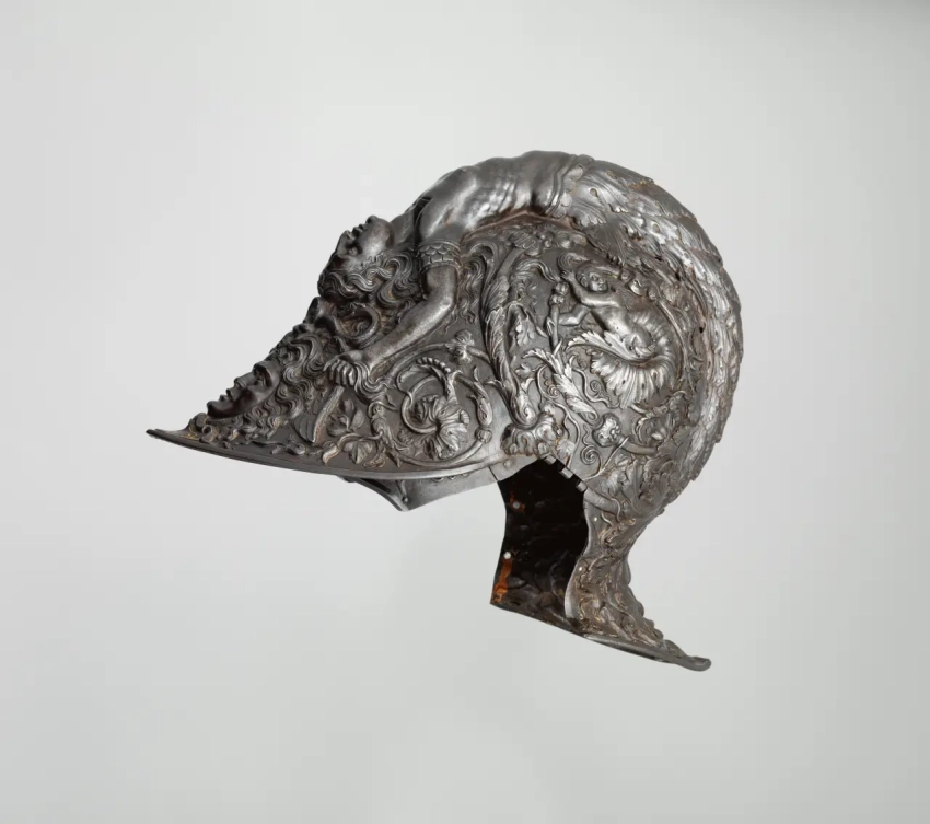 Бургиньот Филиппо Негроли, 1543 г. Высота 24,1 см. Ширина 18,6 см. Диаметр 29,2 см. Вес 1871 г. Метрополитен-музей, Нью-Йорк. Этот шедевр ювелирного искусства эпохи Возрождения украшен подписью Филиппо Негроли на налобнике. Писатели XVI века называли его рельефные доспехи «чудесными» и достойными «бессмертной славы». Чаша шлема, изготовленная из цельного стального листа и патинированная под бронзу, украшена рельефными мотивами, вдохновленными классическим искусством. Изящная сирена, похожая на русалку, образующая гребень шлема, держит за волосы гримасничающую голову горгоны Медузы. Боковые части шлема украшены завитками аканта, на которых изображены путти. Этот мотив восходит к древнеримской скульптуре и настенным росписям
