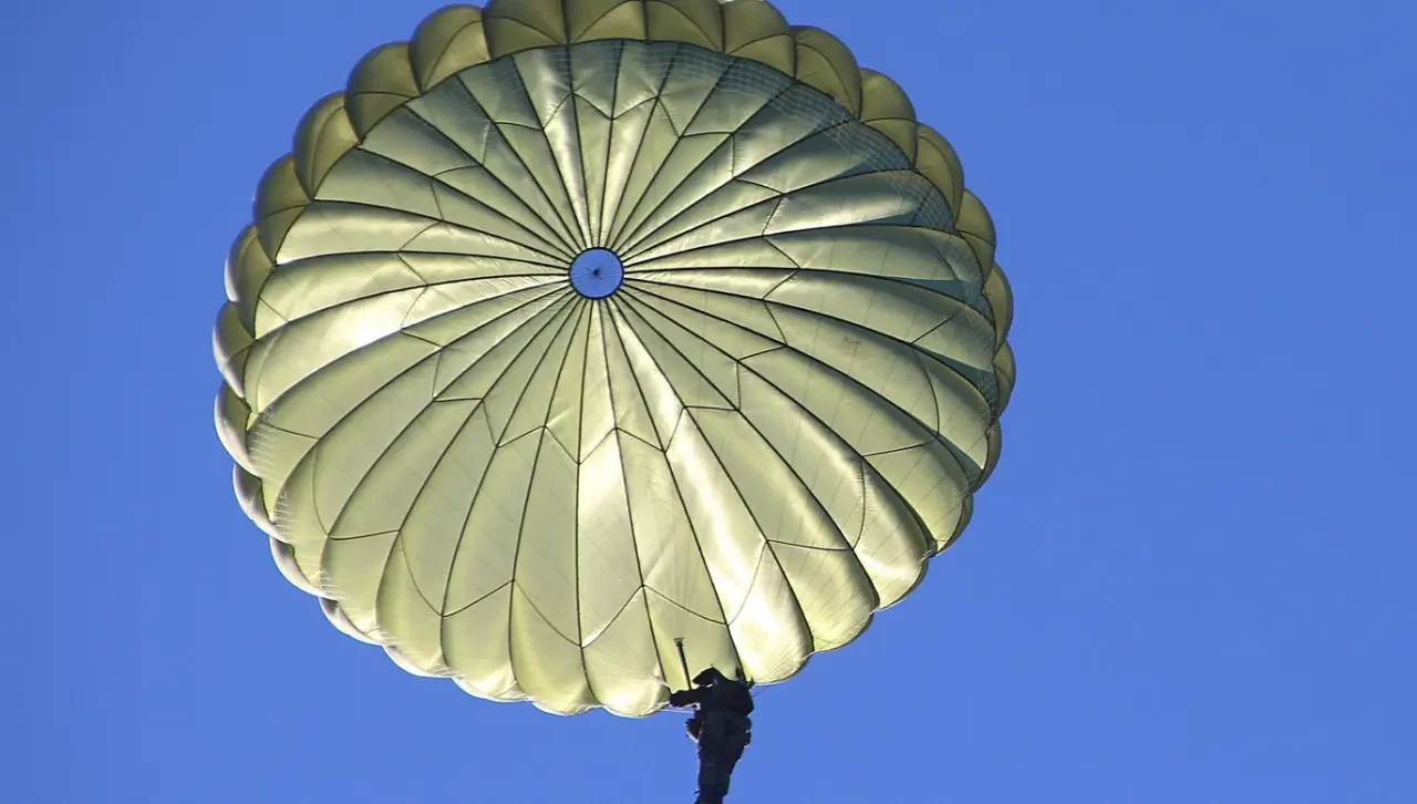 В сети опубликовано видео, на котором можно увидеть спускающегося на парашюте человека, по всей видимости, лётчика сбитого военного самолёта.