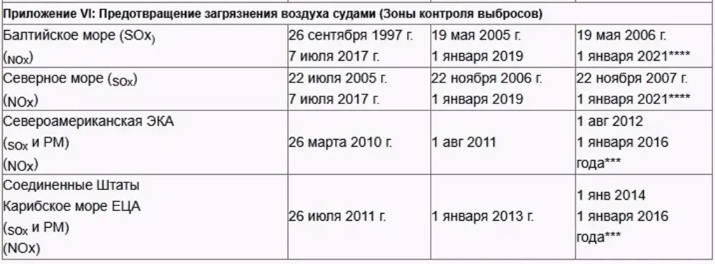 *** Судно, построенное 1 января 2016 года или после этой даты и эксплуатируемое в этих районах контроля выбросов, должно соответствовать нормам NOx уровня III, изложенным в правиле 13.5 Приложения VI к МАРПОЛ.