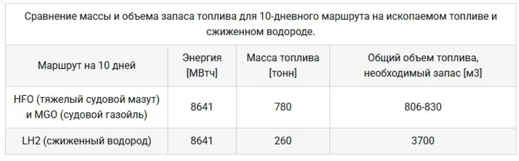 Сравнение массы и объема ископаемого топлива и сжиженного водорода