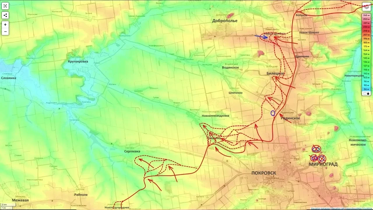 Параллельно идёт наступление к югу и юго-западу от Доброполья. Логика операции, по словам Подоляки, такова: войска, наступающие со стороны Гришино, стремятся выйти в тыл группировке ВСУ в Доброполье, которую одновременно атакуют в лоб подразделения в районе Нового Донбасса и Белицкого. Это классические клещи.