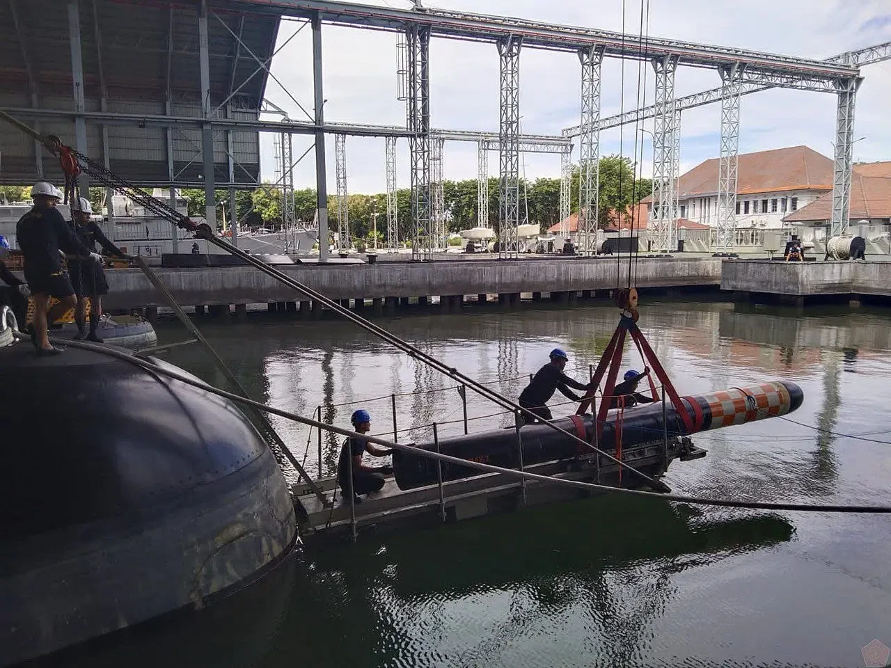 Погрузка итальянской тяжёлой торпеды Black Shark от «Финкантьери» на индонезийскую подлодку «Алугоро».