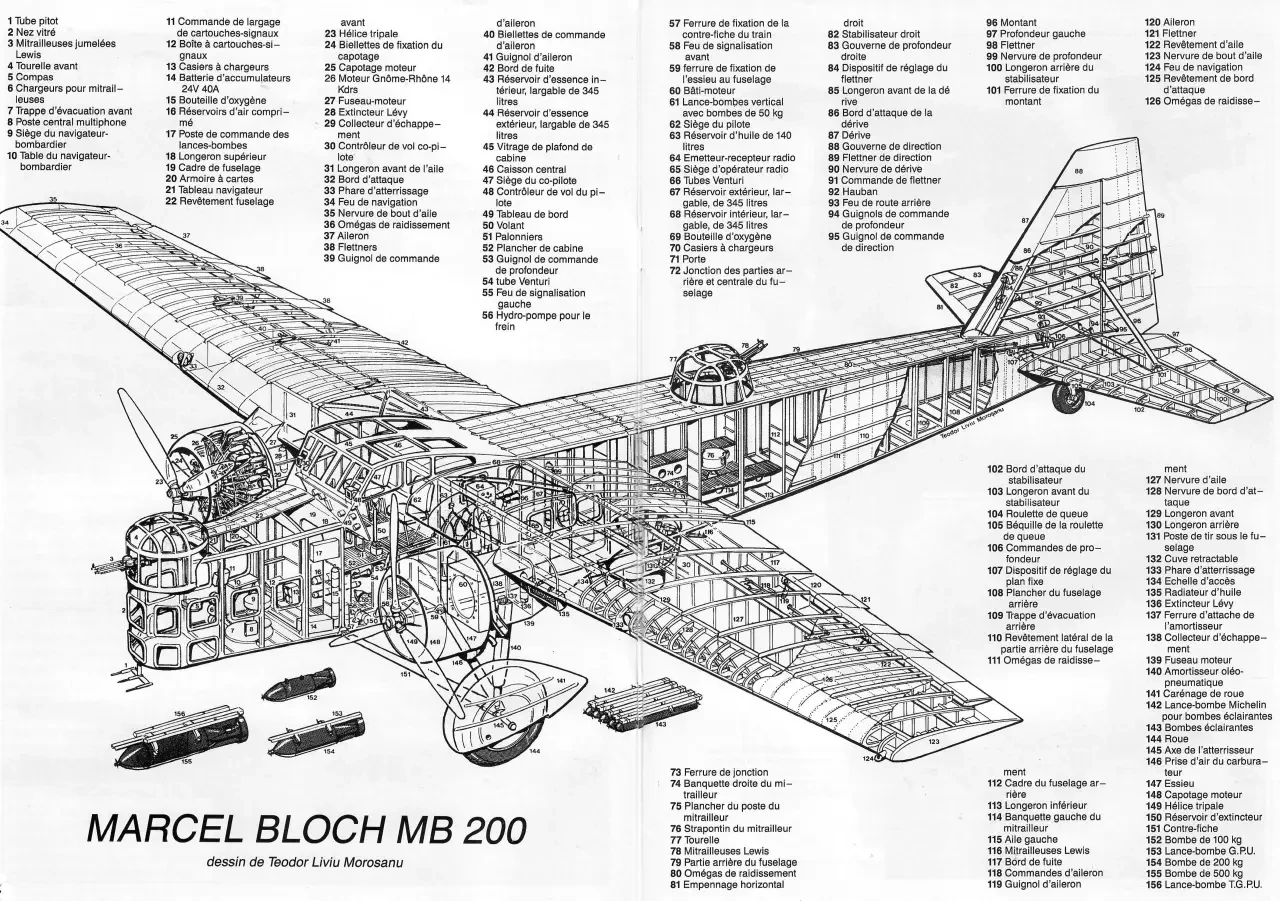 Компания Марселя Блоха была образована совсем недавно, в 1929 году и к 1932 году успела себя проявить прежде всего двумя трехмоторными колониальными самолетами MB.70 и MB.120, которые неплохо себя зарекомендовали, в первую очередь своей прочностью и простотой в управлении. Прототип сохранил многие черты этих машин — цельнометаллический высокоплан с неподвижным шасси. Прямоугольный фюзеляж (плюс для технологичности, а значит, и для цены изделия, минус для аэродинамики) с несущей обшивкой и наружными ребрами жесткости имел 2 верхние управляемые вручную пулеметные турели и нижнюю полуопускаемую ванну. Вместе они обеспечивали оборону 360° практически без мертвых зон — разумеется, за счет аэродинамики.