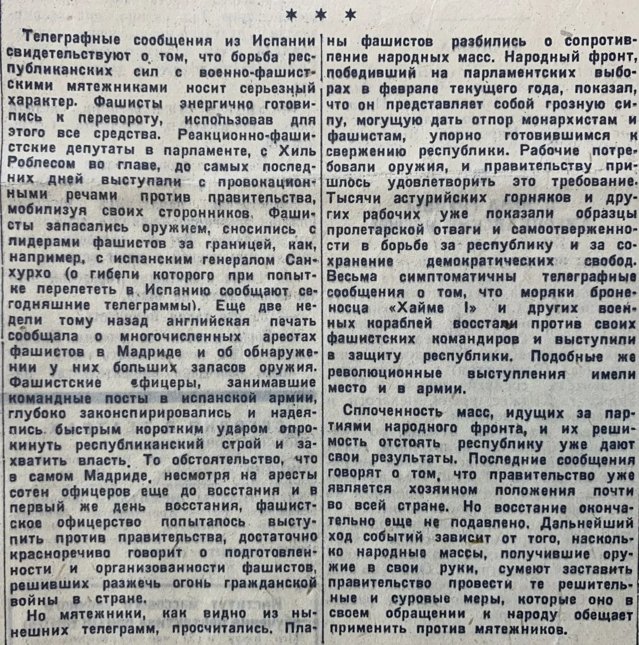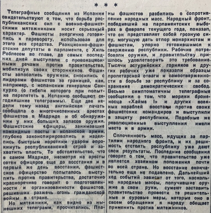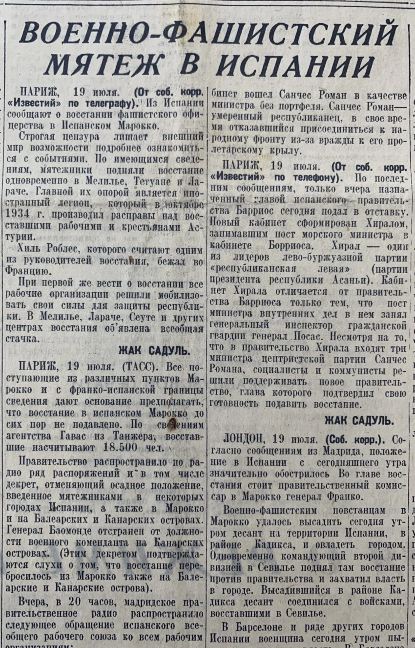 Первое сообщение о мятеже в Испании, и сразу же мятеж объявлен «фашистским». К чему было так спешить, непонятно… В политике вчерашний враг может легко стать другом – и наоборот. А тут р-а-а-з – и ярлык. Понятно, что каждый, кто выступает против законного правительства – мятежник. Но вот фашист ли он при этом… Так что стоило бы хотя бы немного подождать