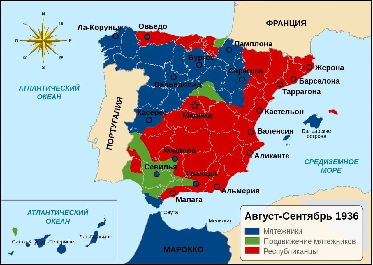 Большая часть ВМС Испании осталась верной республике: линкор «Хайме I», три крейсера («Либертад», «Мигель Сервантес», «Мендес Нуньес»), 16 эсминцев, и все субмарины — всего 27 судов. У путчистов в руках оказались линкор «Эспанья», два недостроенных крейсера («Балеарес» и «Канариас»), два лёгких крейсера, эсминец и четыре канонерские лодки. ВВС Испании также отказались встать на сторону мятежников. И это для них было сильным ударом, так как затруднило переброску войск из Марокко в Испанию.