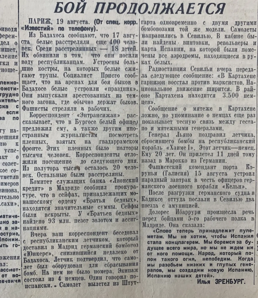 5 августа. Сообщается о помощи мятежникам со стороны Германии и Италии. Вот после этого вполне можно было бы сказать: «Кто принимает помощь от фашистов, тот и сам фашист!». Все было бы логично и обоснованно