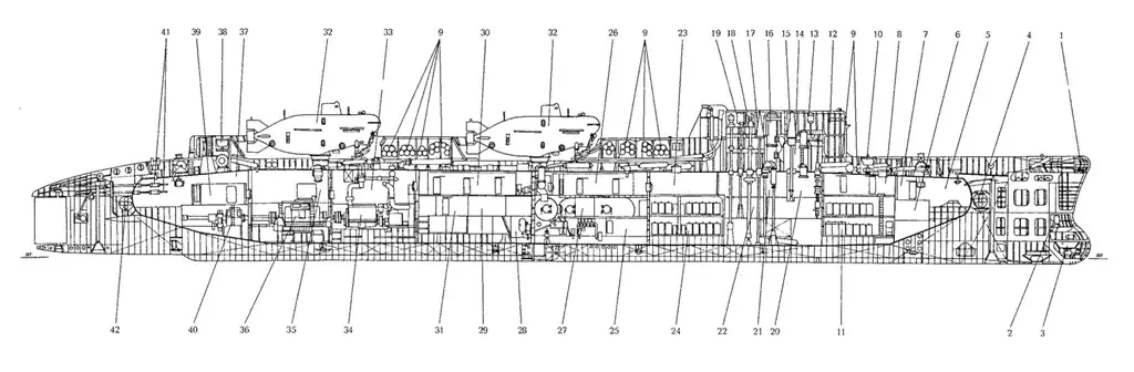 Имелось также специальное якорное устройство, которое обеспечивало лодке ее постановку, стоянку и снятие с якорей в подводном положении на глубинах места до 500-600 м на расстоянии 200-300 м от грунта при наличии течения до 2 уз.