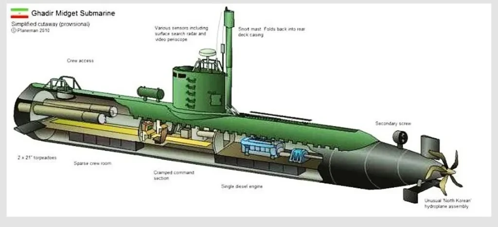 А в феврале 2004 года появились первые сведения о создании в Иране отечественной минисубмарины “Ghadir”. Естественно, ТТХ засекречены, поэтому приведенные данные являются приблизительными. Ее надводное/подводное водоизмещение составляет 117/125 т, скорость - 10/8 узлов, экипаж по разным данным составляет от 7 до 18 человек. Вооружение состоит из двух 533-миллиметровых торпедных аппаратов, предназначенных для использования торпед различных типов, включая ракетные «Хут» (Hoot) - аналог российского «Шквала», крылатых ракет и постановки мин. Лодки также могут использоваться для высадки боевых пловцов.