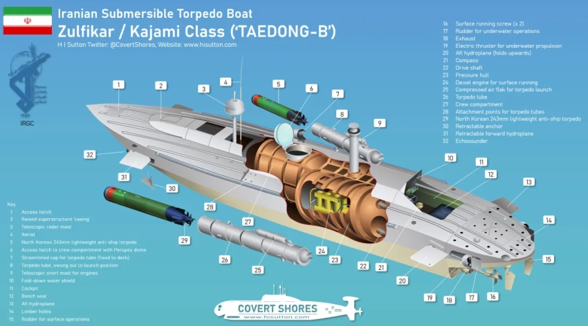 На вооружении Ирана состоит также 533-мм торпеда “Ajdar”. Литий-ионная аккумуляторная батарея позволяет ей двигаться экономическим ходом до 96 часов на расстояние более 320 миль или со скоростью 22-25 узлов преодолевать дистанцию до 70 миль.