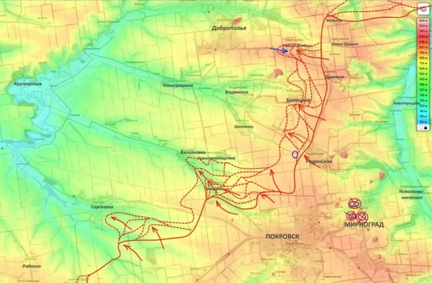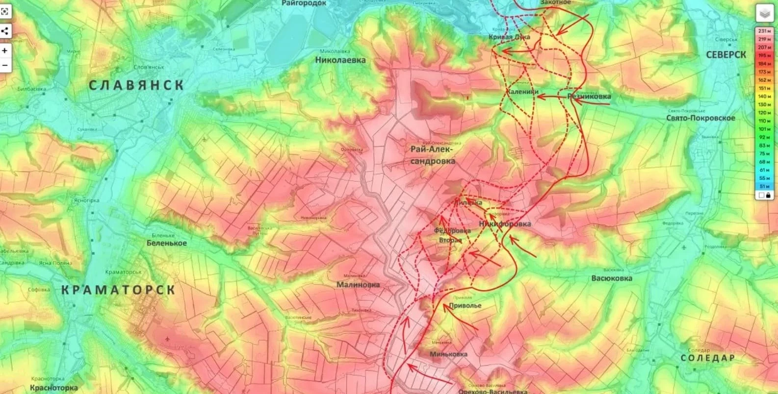 По словам военного эксперта, генерал-майора Владимира Попова, сейчас российские войска активно наступают в районе Доброполья, пытаясь вклиниться с юга и обойти Дружковку, чтобы выйти в тыл всей группировке ВСУ. Он считает, что аналогичный маневр ВС РФ реализуют и с северного направления. Только после подготовки обоих флангов начнется решающее сражение за Донбасс.