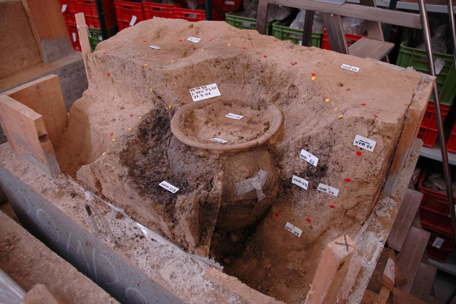 Поскольку с момента их первоначального извлечения прошли десятилетия, илистая глина почвенных блоков стала настолько плотной и твердой, что почти непроницаема для воды. Поэтому ее необходимо выкапывать насухо, направляя только небольшие струи воды только на почву, избегая любого контакта с керамикой. Керамика сильно фрагментирована, и сухое соскабливание, необходимое для выкапывания ящиков, часто приводит к расширению микротрещин. Чтобы находки оставались на месте для тщательного процесса документирования, к местам изломов приклеивается очень тонкая японская бумага с помощью акриловой смолы.