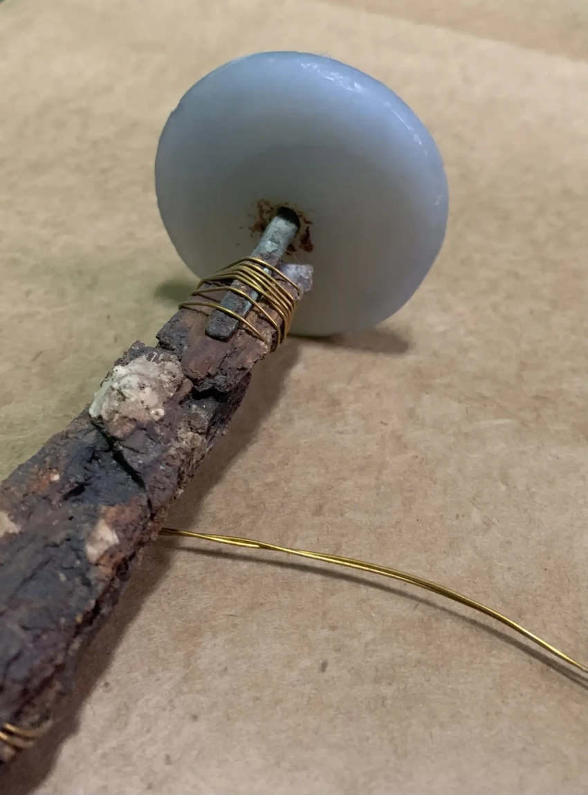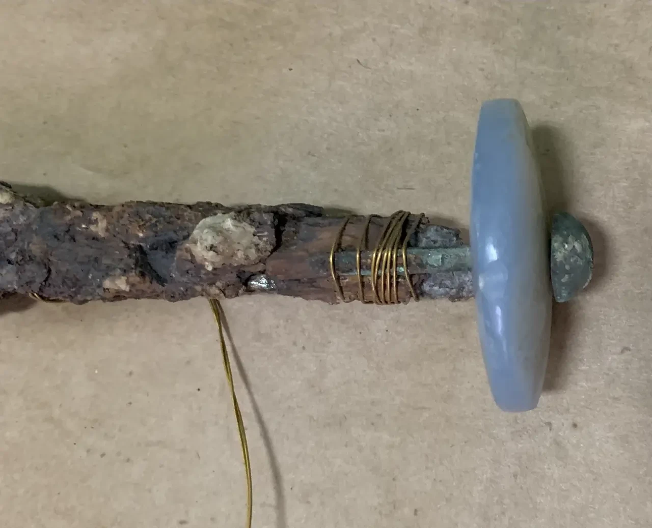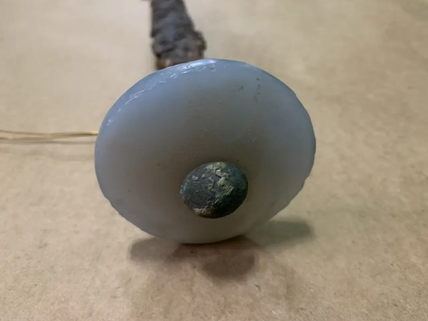 Очень интересное было крепление диска из халцедона. Его просто прибивали к рукоятке при помощи двух бронзовых «усов», которые охватывали при этом плоский железный черенок клинка…