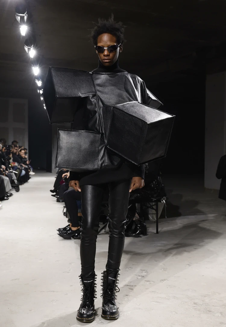 Еще один японский модельер Джуниа Ватанабе пофантазировал на тему оригами в одежде. Так, по подиуму прошлась модель в тренче, который, как будто выкроили методом оригами. Еще один запоминающийся образ — кожаная куртка с пришитыми к рукавам сапогами. Японские дизайнеры явно наступают на пятки Демне Гвасалии.