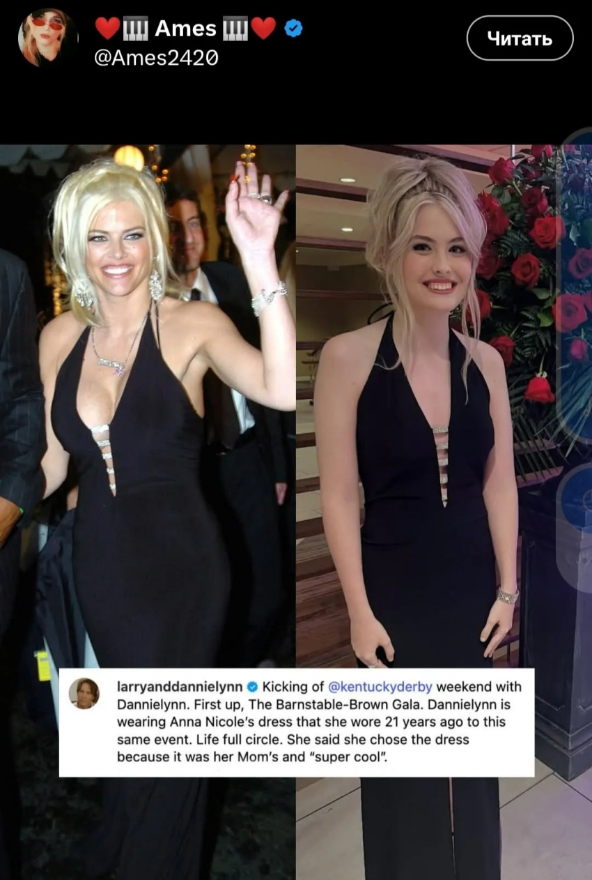 Дэннилин и Ларри БиркхедДэннилин и Ларри БиркхедАнна Николь СмитСтоит отметить, что скачки Kentucky Derby имеют особое значение для Ларри и Дэннилин, поскольку Анна Николь впервые встретилась с будущим отцом своей дочери на гала-вечере Barnstable Brown в 2003 году. Напомним, что знаменитая модель Playboy умерла в возрасте 39 лет в 2007 году, оставив всё состояние дочери. Причиной её смерти стала передозировка медицинских препаратов.