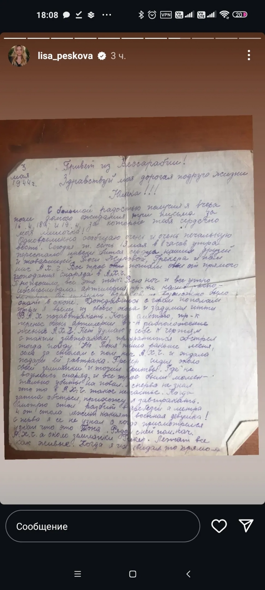 Друзья, поздравляю вас с великим праздником, с Днём Победы! От всей души желаю беречь наших дорогих ветеранов Их истории, воспоминания родных и близких помогают сохранить память о Великой Отечественной войне. Моя бабушка пережила оккупацию, пряталась от врага в землянке с моей мамой, которая была ещё ребёнком. Дедушка прошёл войну, получил тяжёлое ранение под Ростовом-на-Дону и потом работал в тылу. Они оба преодолели столько трудностей, но сохранили доброе сердце, чувство юмора и умение сочувствовать другим людям. Они навсегда останутся в моём сердце, их героизм и стойкость вдохновляют меня каждый день. Гордость, благодарность и любовь к ним непоколебимы. Пусть наша общая память о тех, кто боролся и пожертвовал собой ради мира, живёт вечно. С праздником, дорогие друзья!Ирина БезруковаФото Лизы ПесковойЛиза Пескова