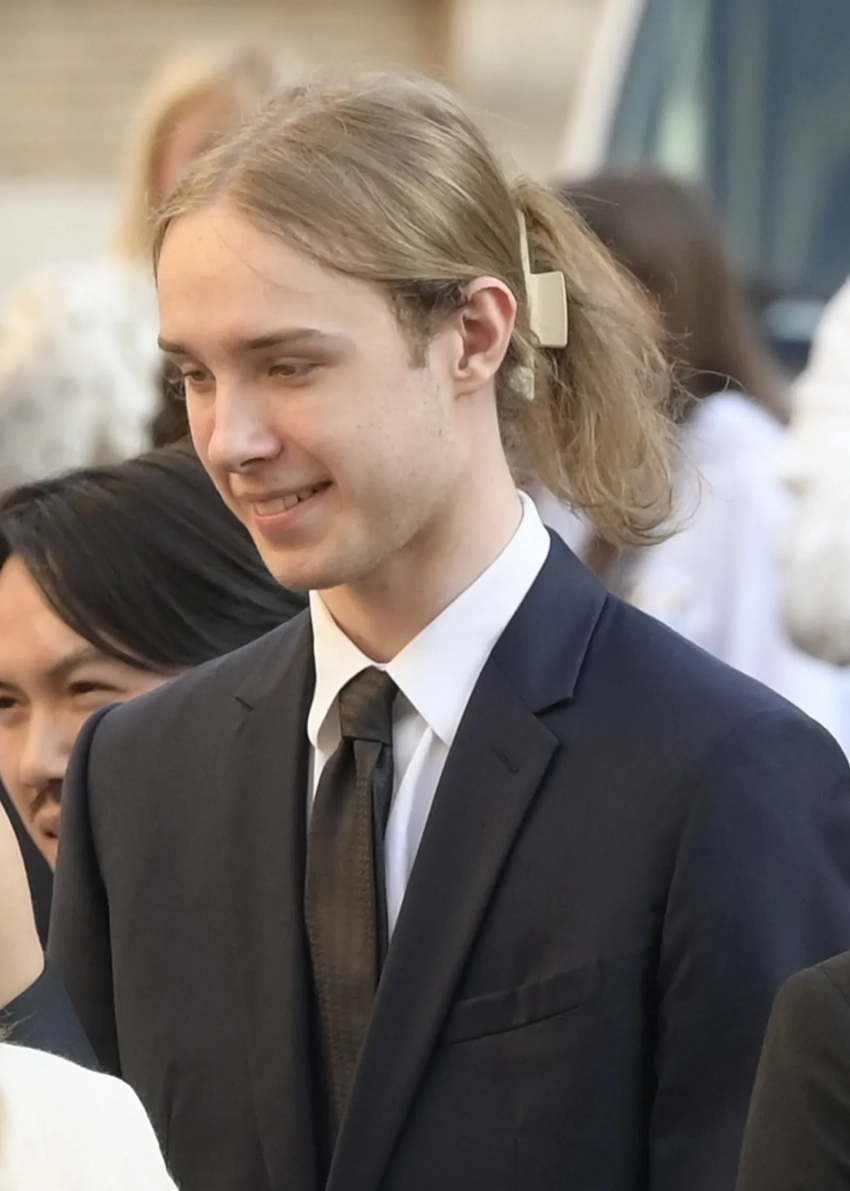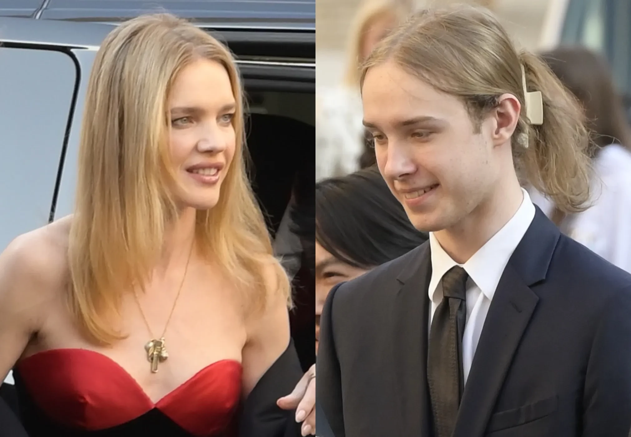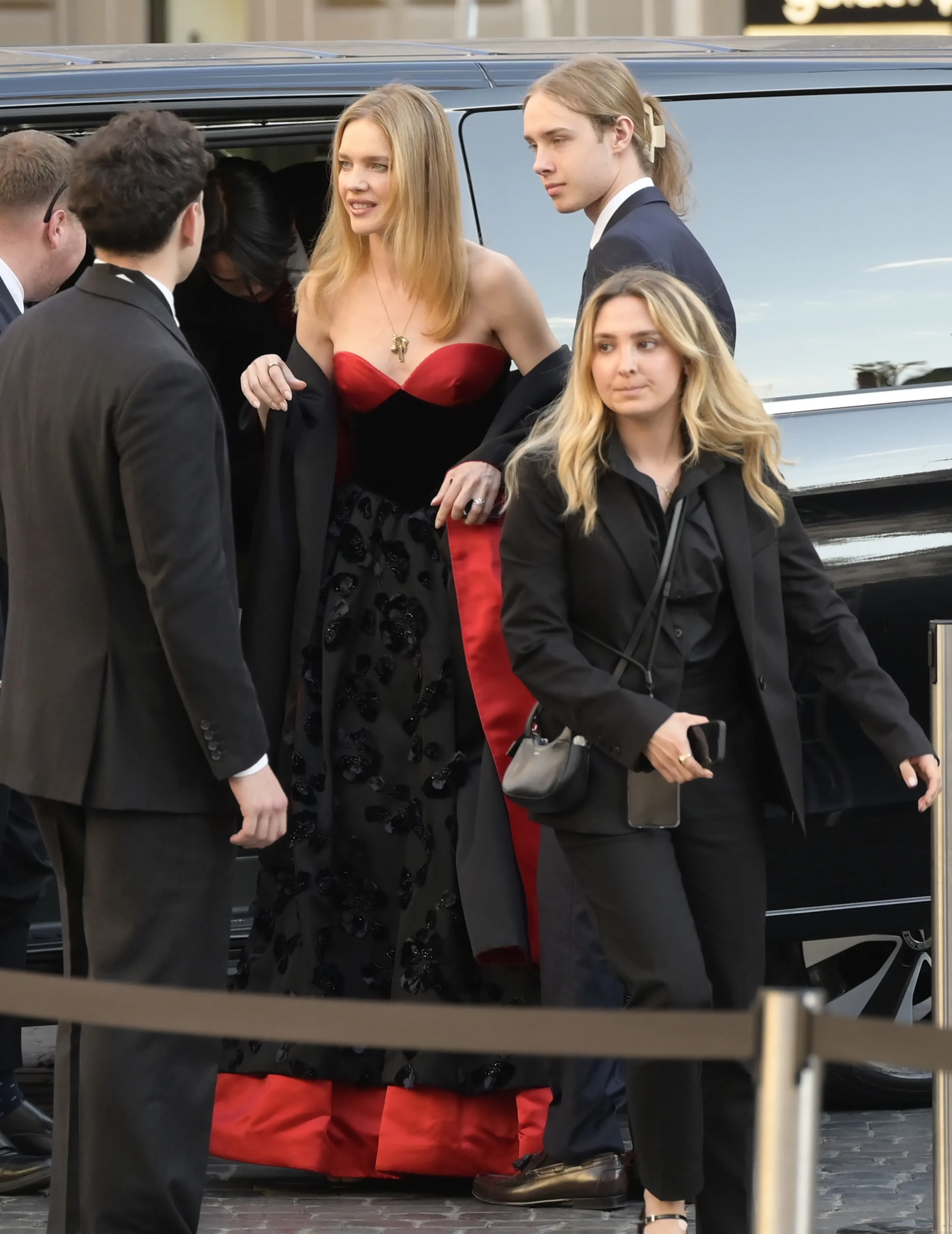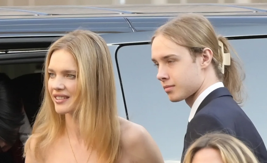 Звезду с сыном засняли во время выхода из машины. Наталья была одета в вечернее платье Valentino, а Виктор — в синий брючный костюм с галстуком. Длинные волосы наследник модели заколол "крабиком".