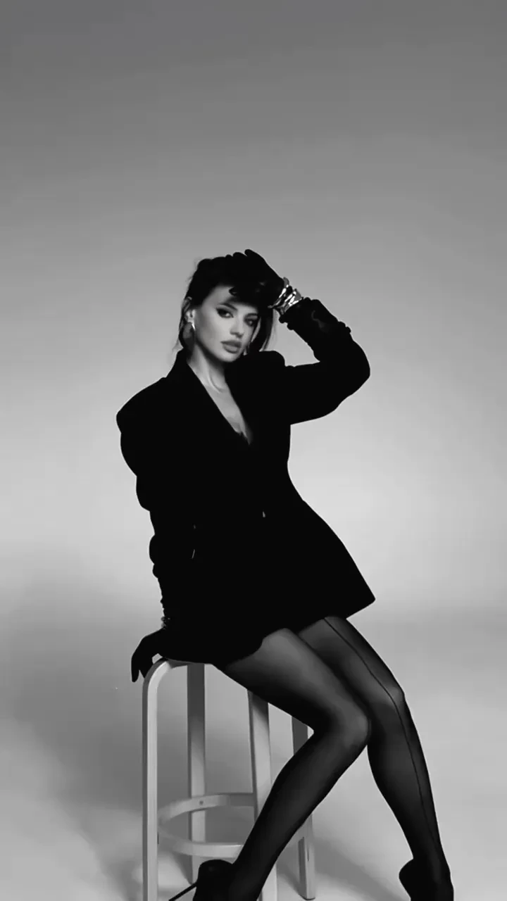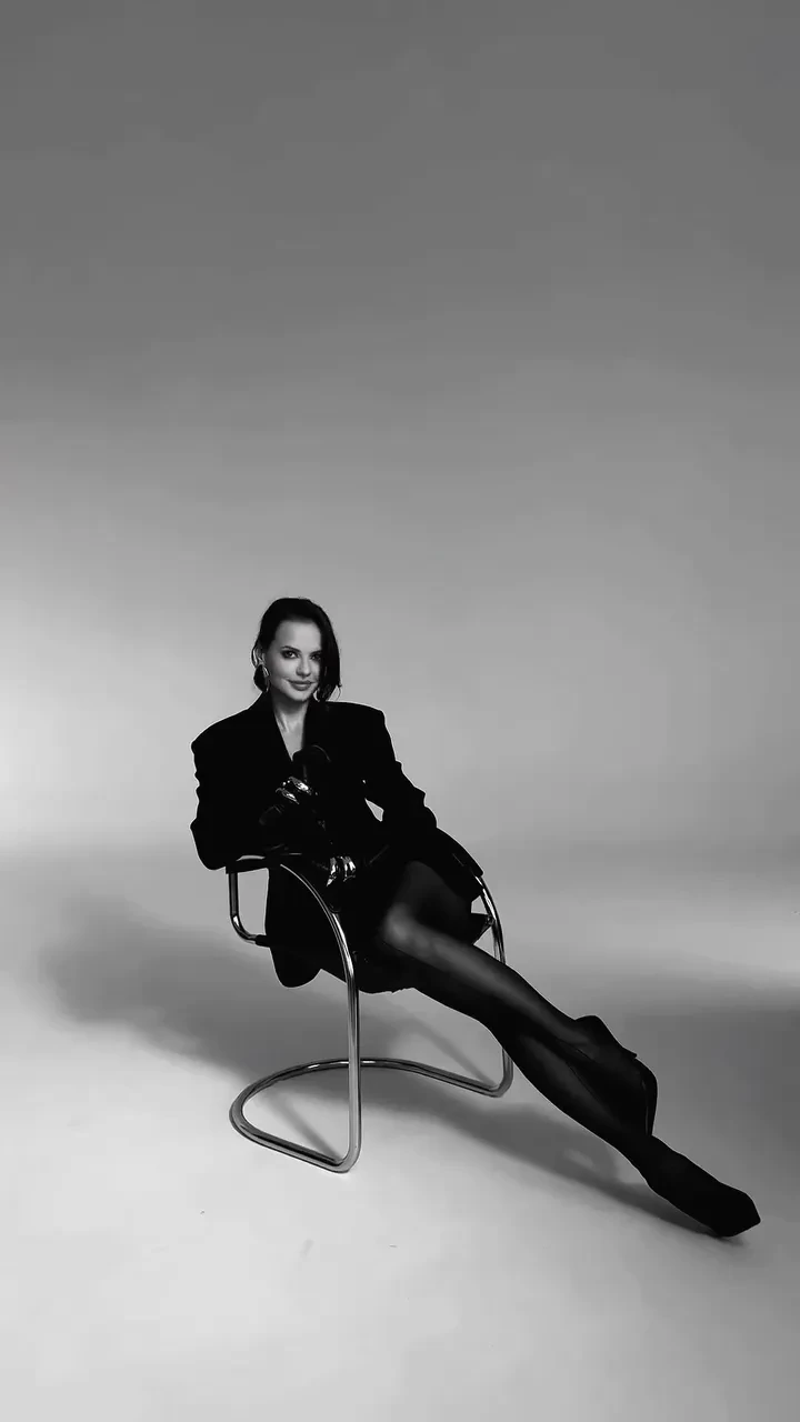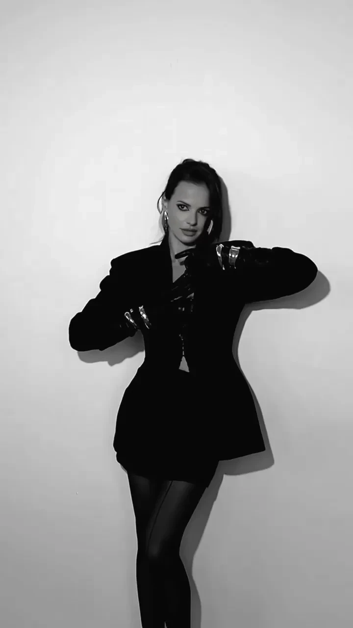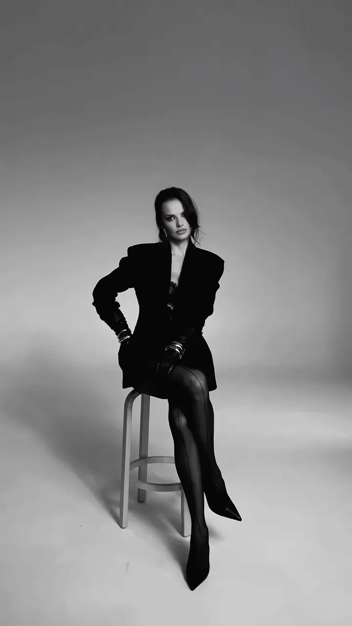 https://t.me/spletnik2006/35681В чёрно-белом ролике Россияна позирует в разных позах. Она одета в пиджак поверх кружевного чёрного белья и чулок со стрелкой. Образ дополняют туфли на шпильке, крупные золотые украшения и кожаные перчатки.