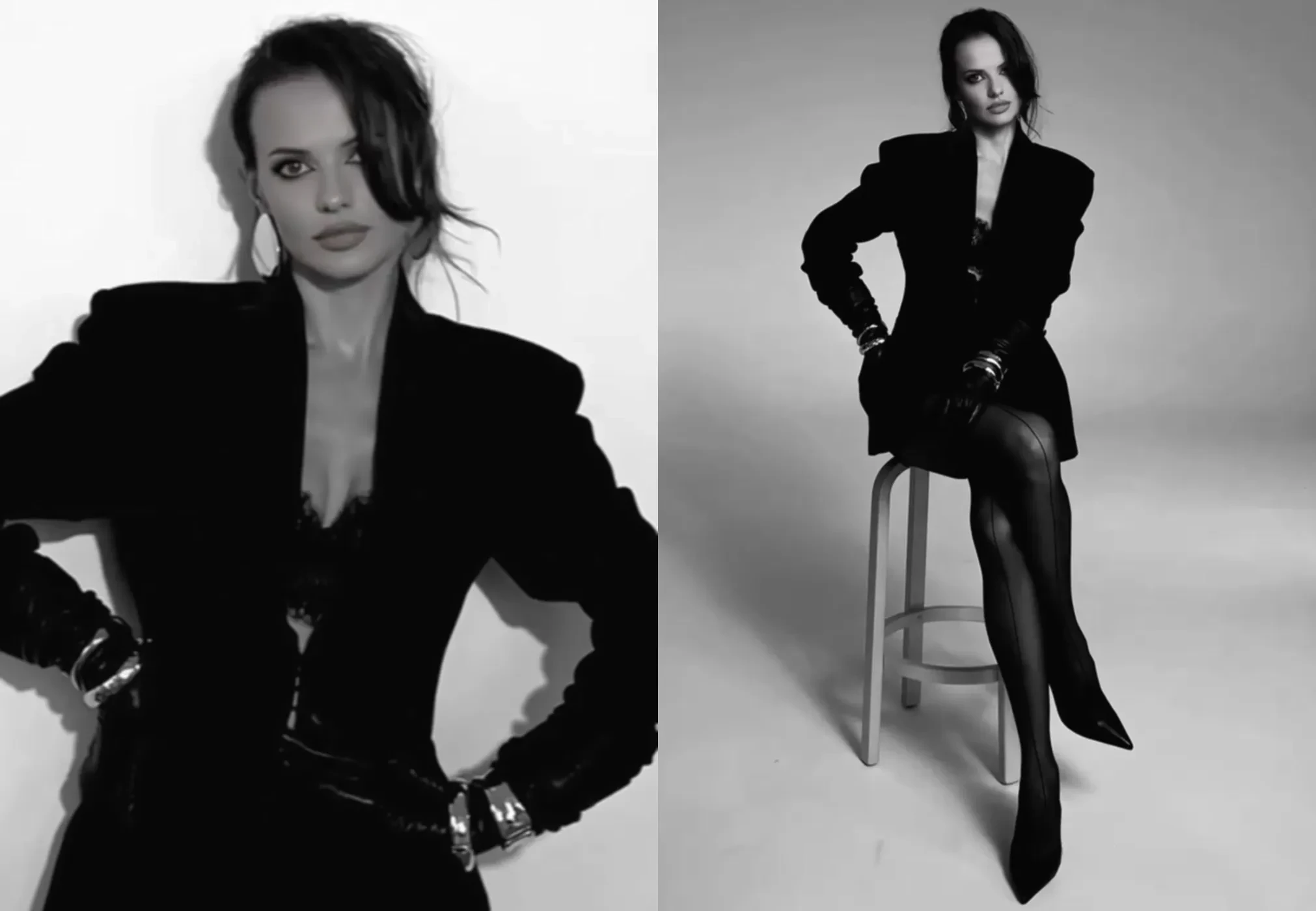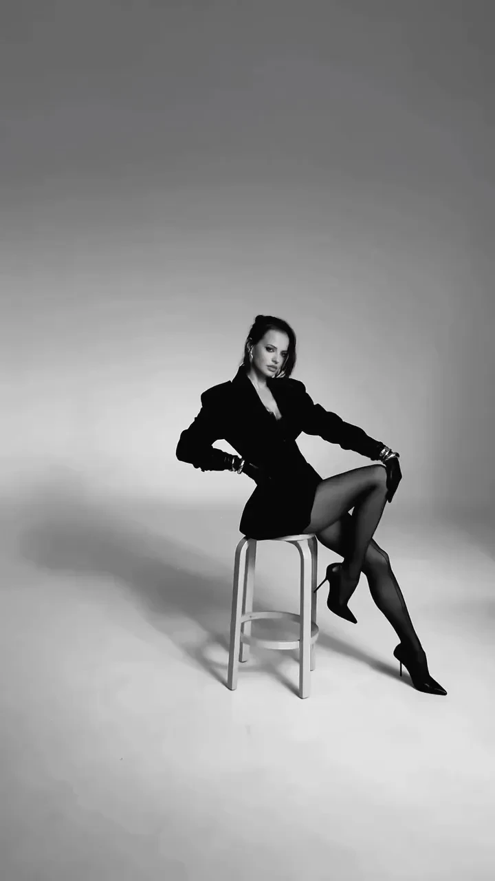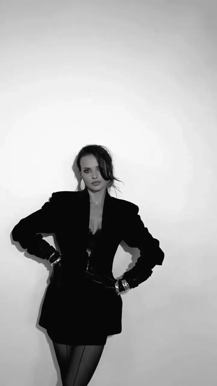 https://t.me/spletnik2006/35681В чёрно-белом ролике Россияна позирует в разных позах. Она одета в пиджак поверх кружевного чёрного белья и чулок со стрелкой. Образ дополняют туфли на шпильке, крупные золотые украшения и кожаные перчатки.