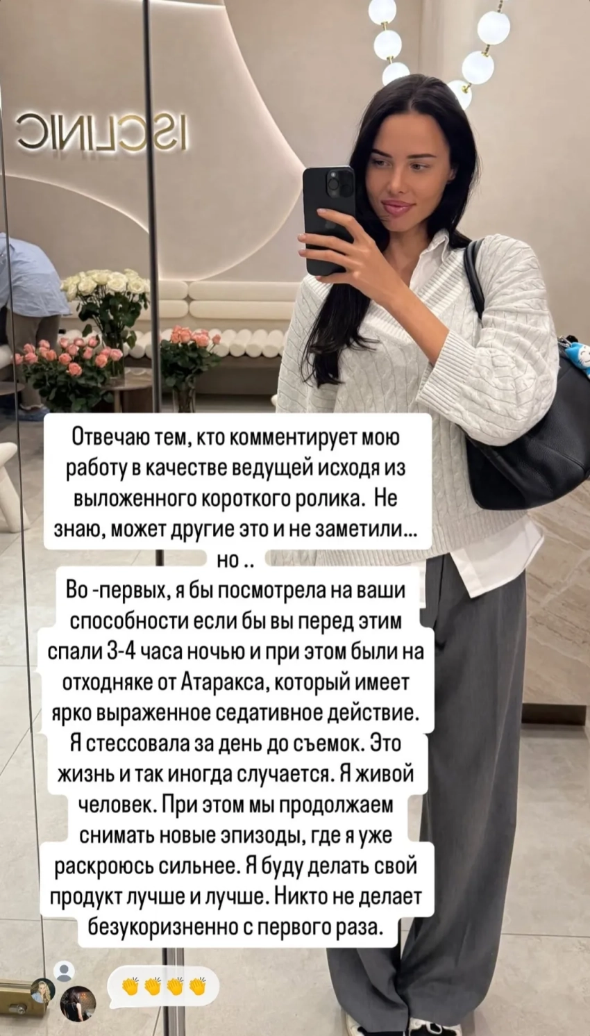 https://t.me/spletnik2006/39075Анастасия решила ответить на критику. В сторис* она объяснила, что переживала перед съёмками, мало спала, а также на её состояние повлиял приём таблеток: “Я бы посмотрела на ваши способности, если бы вы перед этим спали 3-4 часа ночью и при этом были на отходняке от "Атаракса", который имеет ярко выраженное седативное действие. Я стрессовала за день до съёмок. Это жизнь, и так иногда случается. Я живой человек”.