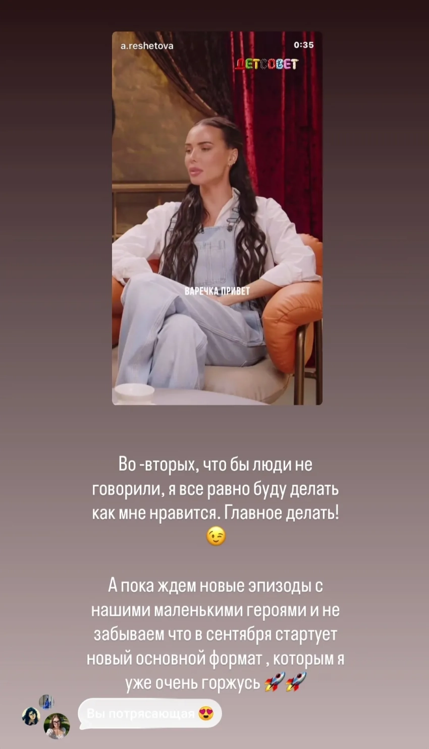 Скриншот из соцсетей Анастасии РешетовойСкриншот из соцсетей Анастасии РешетовойПри этом Решетова отметила, что продолжит сниматься в новых эпизодах, где она “раскроется сильнее”: “Я буду делать свой проект лучше и лучше. Никто не делает безукоризненно с первого раза. <...> Что бы люди ни говорили, я всё равно буду делать, как мне нравится. Главное делать!”.