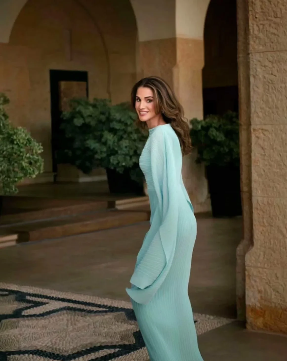 На первом снимке Рания запечатлена в бирюзовом макси-платье с длинными рукавами.