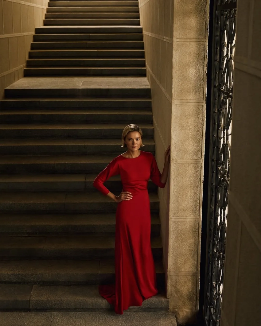 Для фотосессии Надежда примерила платье и юбку с георгинами, красное платье из шёлка, костюм из твида, шерстяное пальто и другие изделия из новой коллекции бренда.