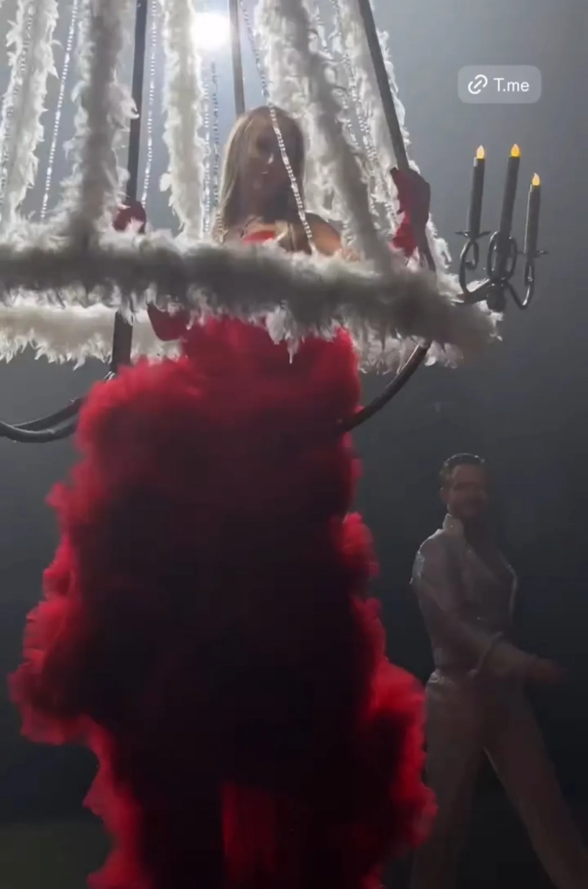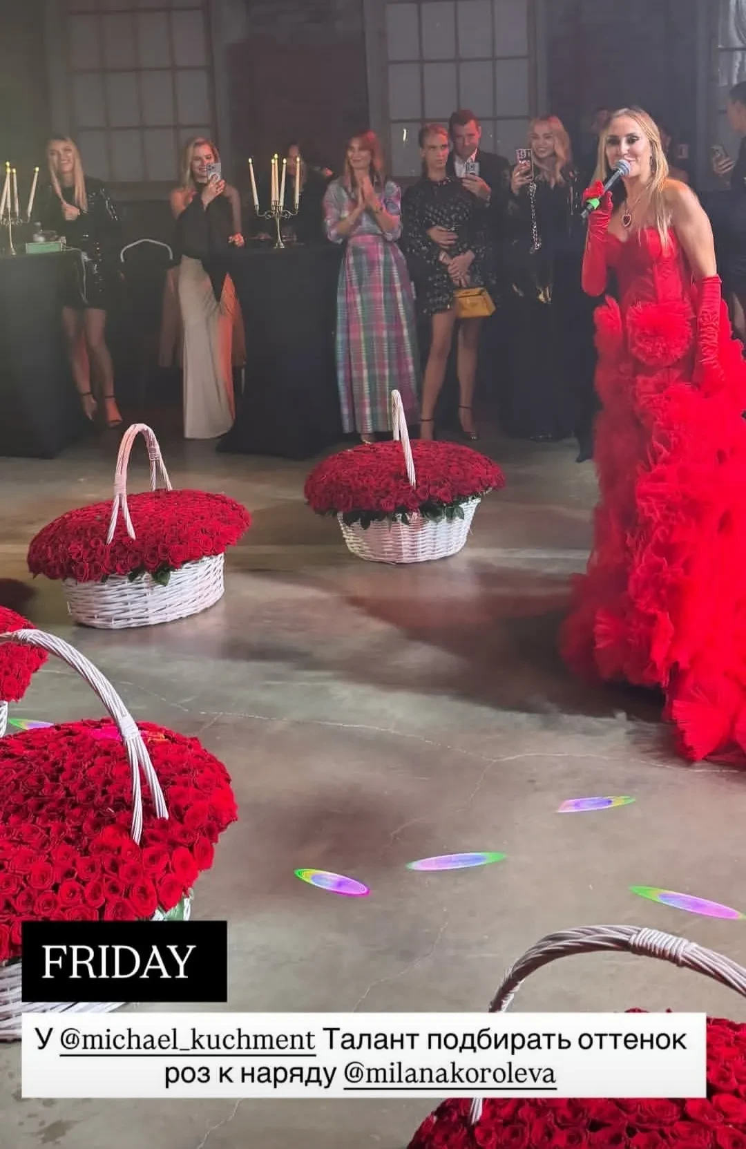 Приглашённых ожидало целое представление: сначала именинница спустилась к ним с потолка верхом на люстре, затем перед ними выступили воздушные гимнасты и группа "Моя Мишель" со своими хитами. Дресс-код и убранство помещения, украшенного множеством цветов, были в красном и чёрном оттенках.