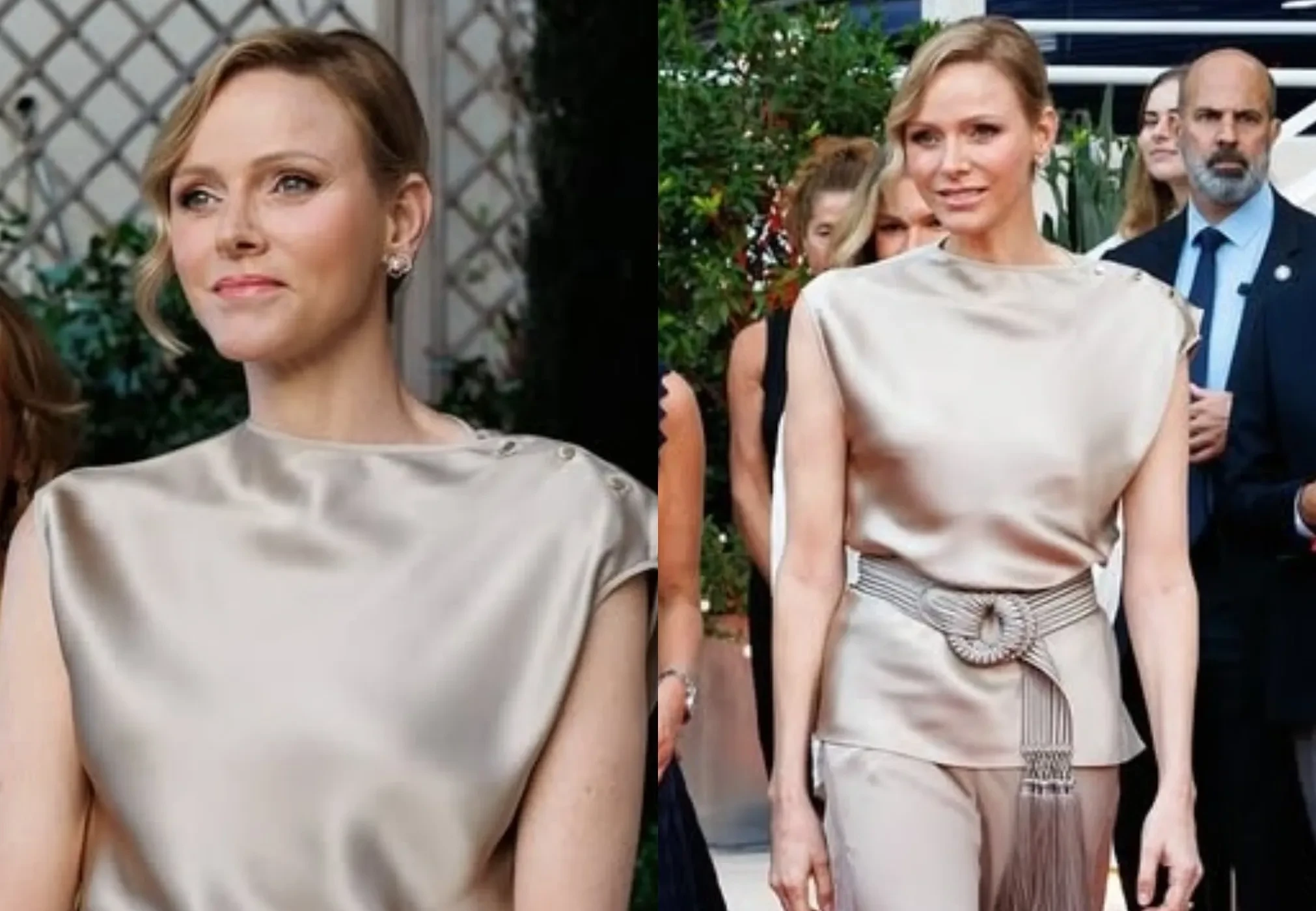 47-летняя Шарлен вышла в свет в шёлковой блузе без рукавов и широких брюках, дополнив образ плетёным поясом и замшевыми туфлями в тон.