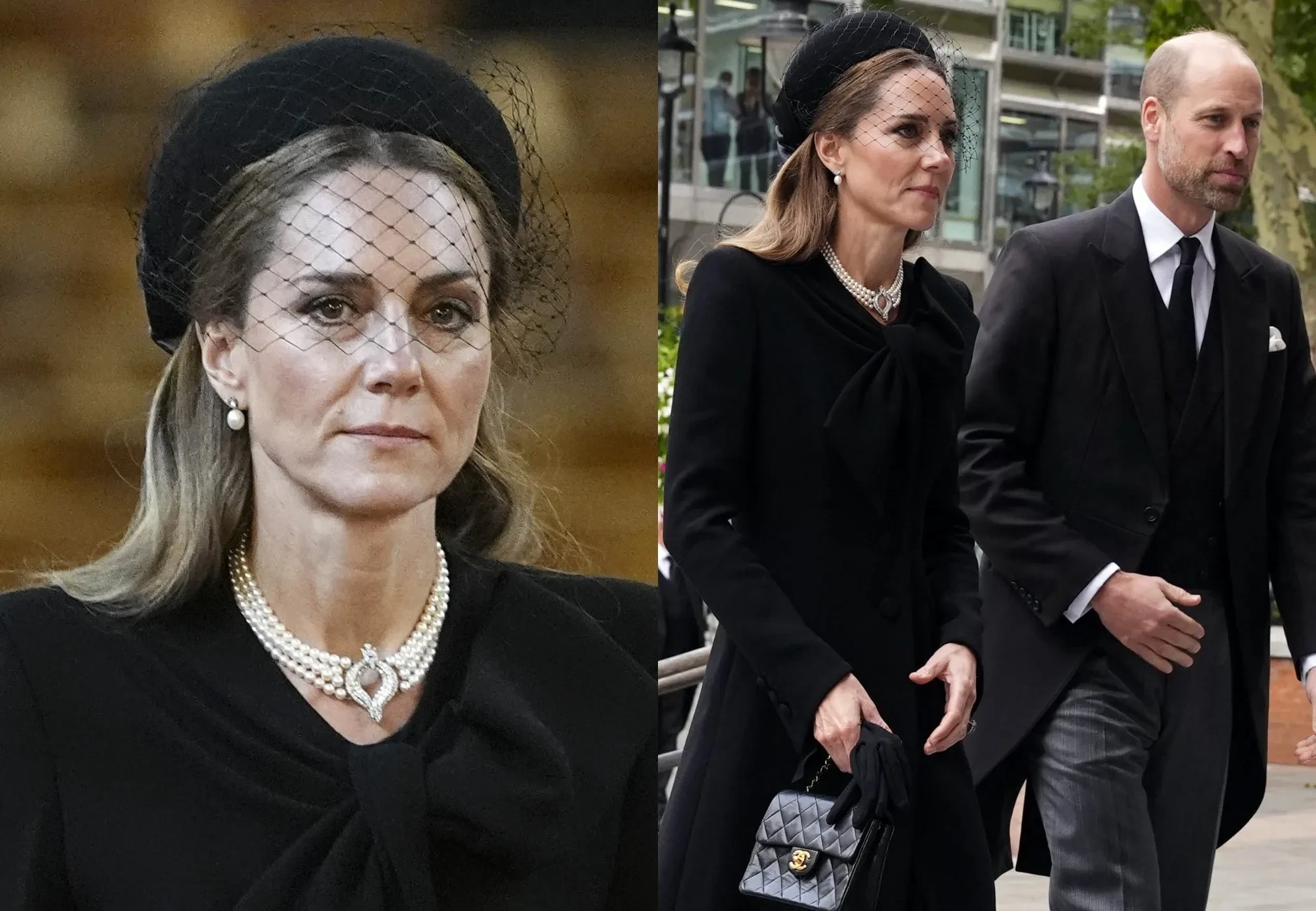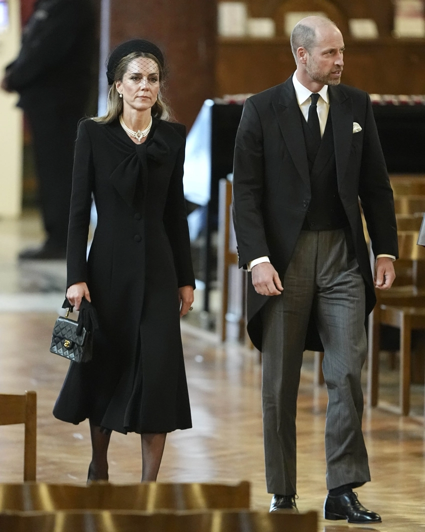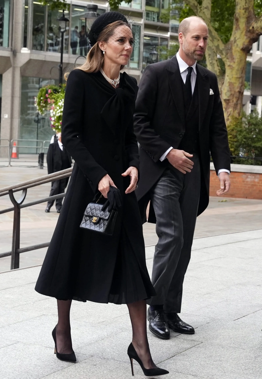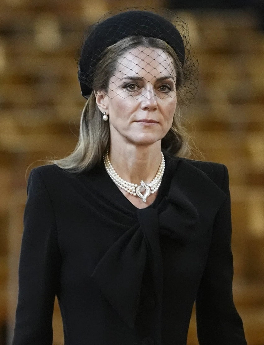 43-летняя Кейт Миддлтон появилась на публике в чёрном платье, дополнив образ сумкой Chanel, шляпой с вуалью и жемчужным колье, которое ранее принадлежало покойной королеве Елизавете II. Принцесса Уэльская уже надевала это ожерелье на похоронах самой королевы в 2022 году, а также её мужа принца Филиппа в 2021 году.