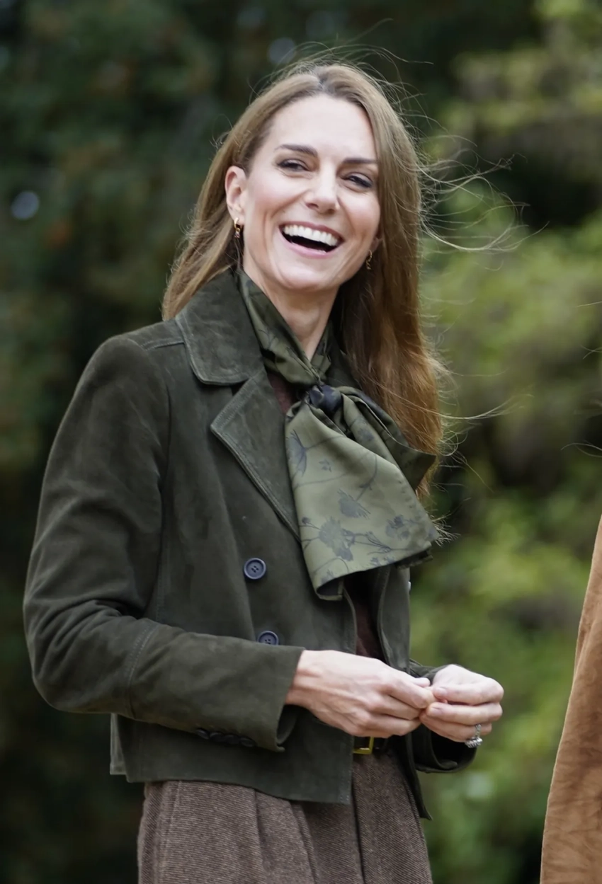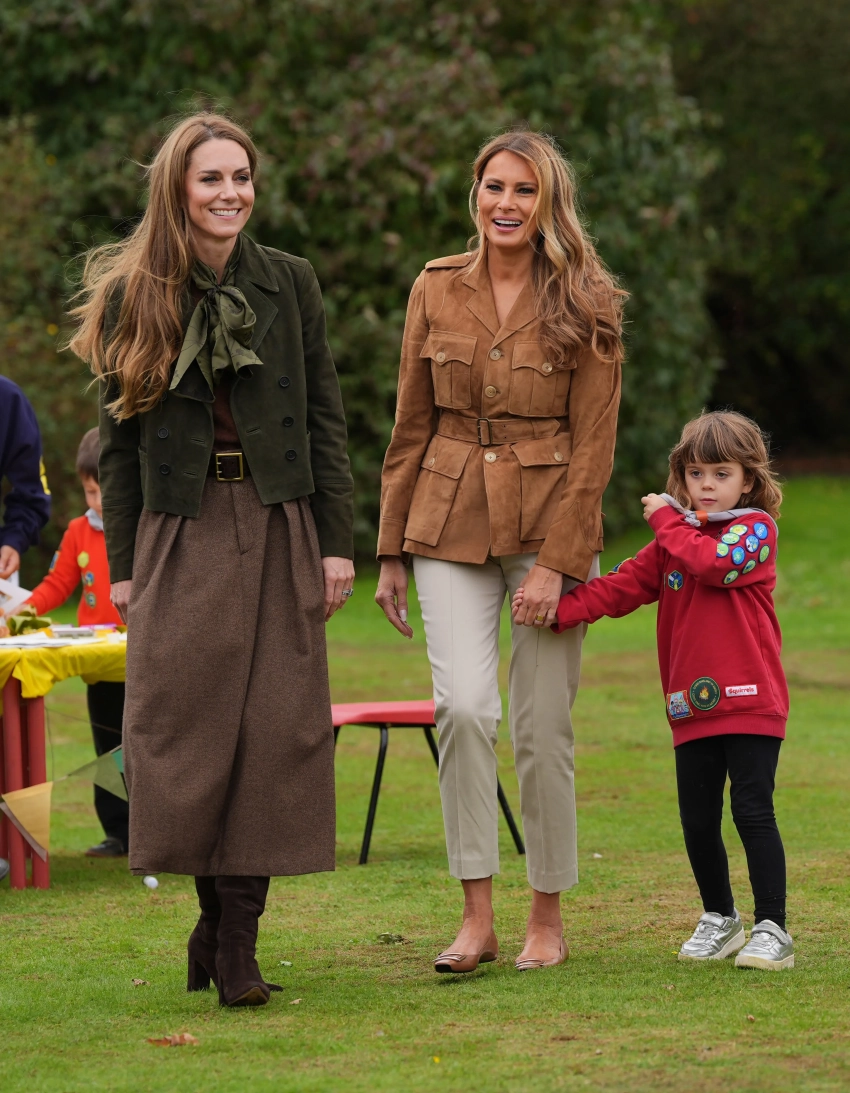 В последний день государственного визита Трампов 43-летняя принцесса Уэльская и первая леди США посетили сады и коттедж Фрогмор в Виндзоре, где встретились с участниками скаутской программы "Белки" и их лидером Дуэйном Филдсом. Кейт, которая с 2020 года является сопрезидентом Скаутской ассоциации, была одета в шерстяную коричневую юбку и зелёный жакет с бантом, а 55-летняя Мелания выбрала для мероприятия замшевый жакет с поясом и светлые брюки.