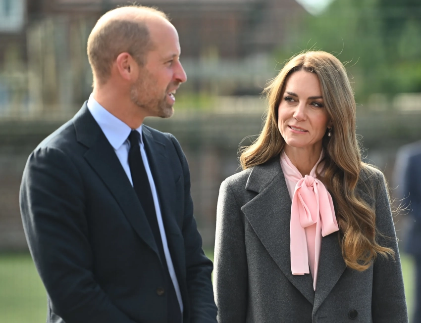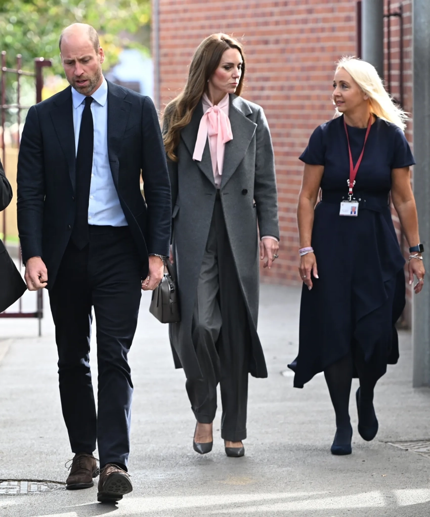 Для визита 43-летняя принцесса Уэльская надела серое пальто прямого силуэта, широкие брюки в тон и розовую блузу с бантом, а 43-летний принц Уильям выбрал классический костюм с галстуком.