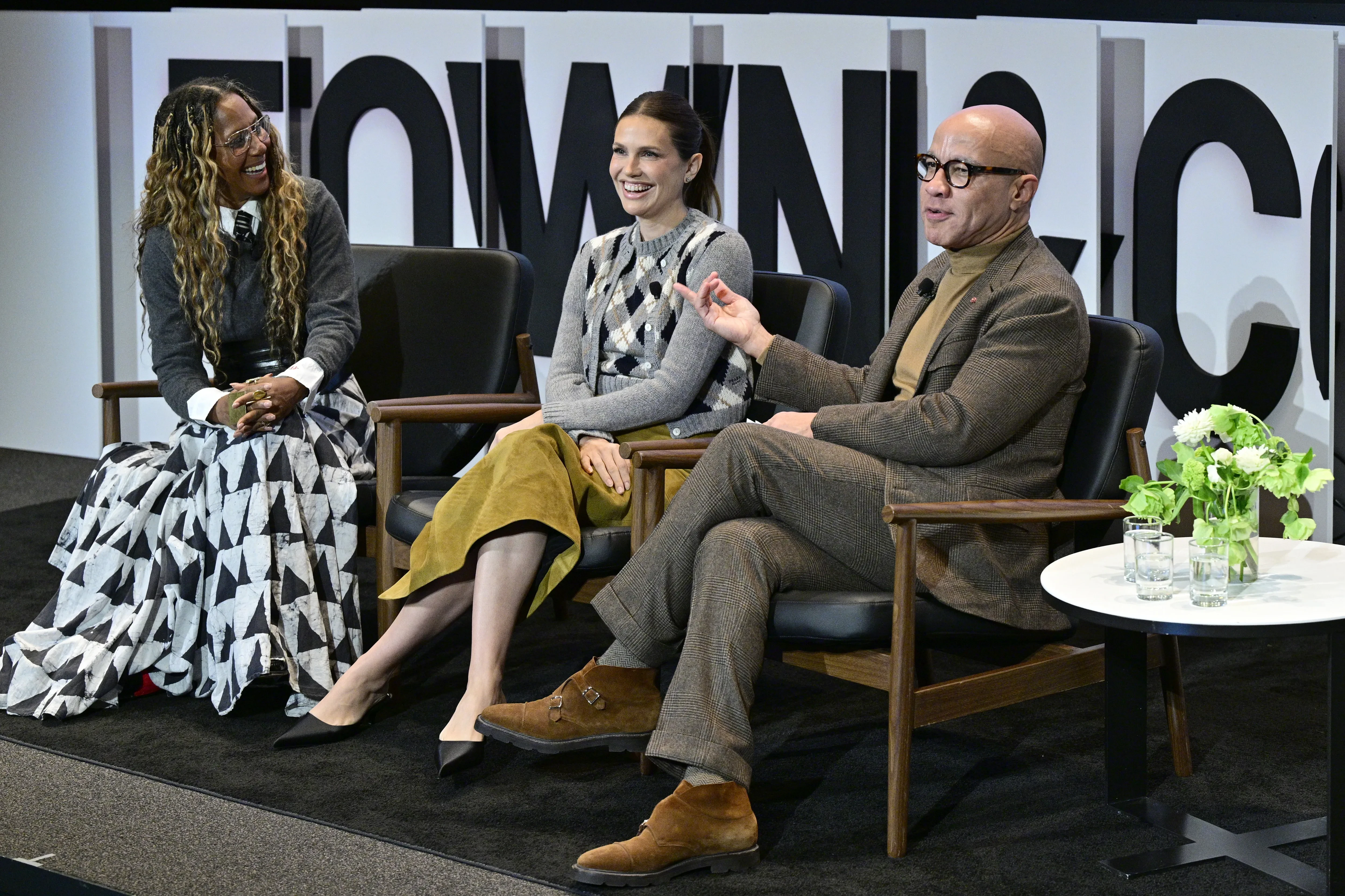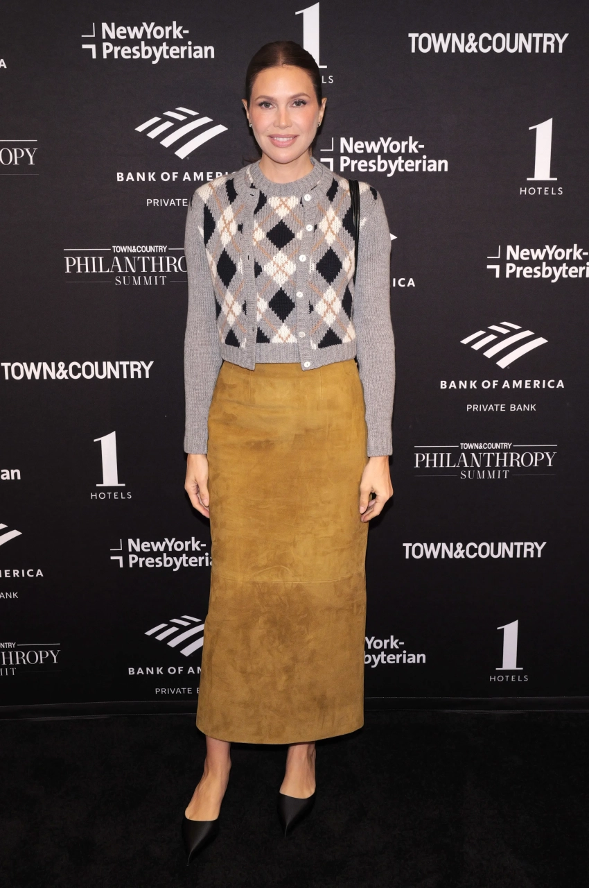 Для саммита 44-летняя Жукова выбрала серый кардиган с ромбовидным узором и горчичную юбку миди. Образ она дополнила минималистичными серьгами, чёрной сумкой и классическими туфлями-лодочками.