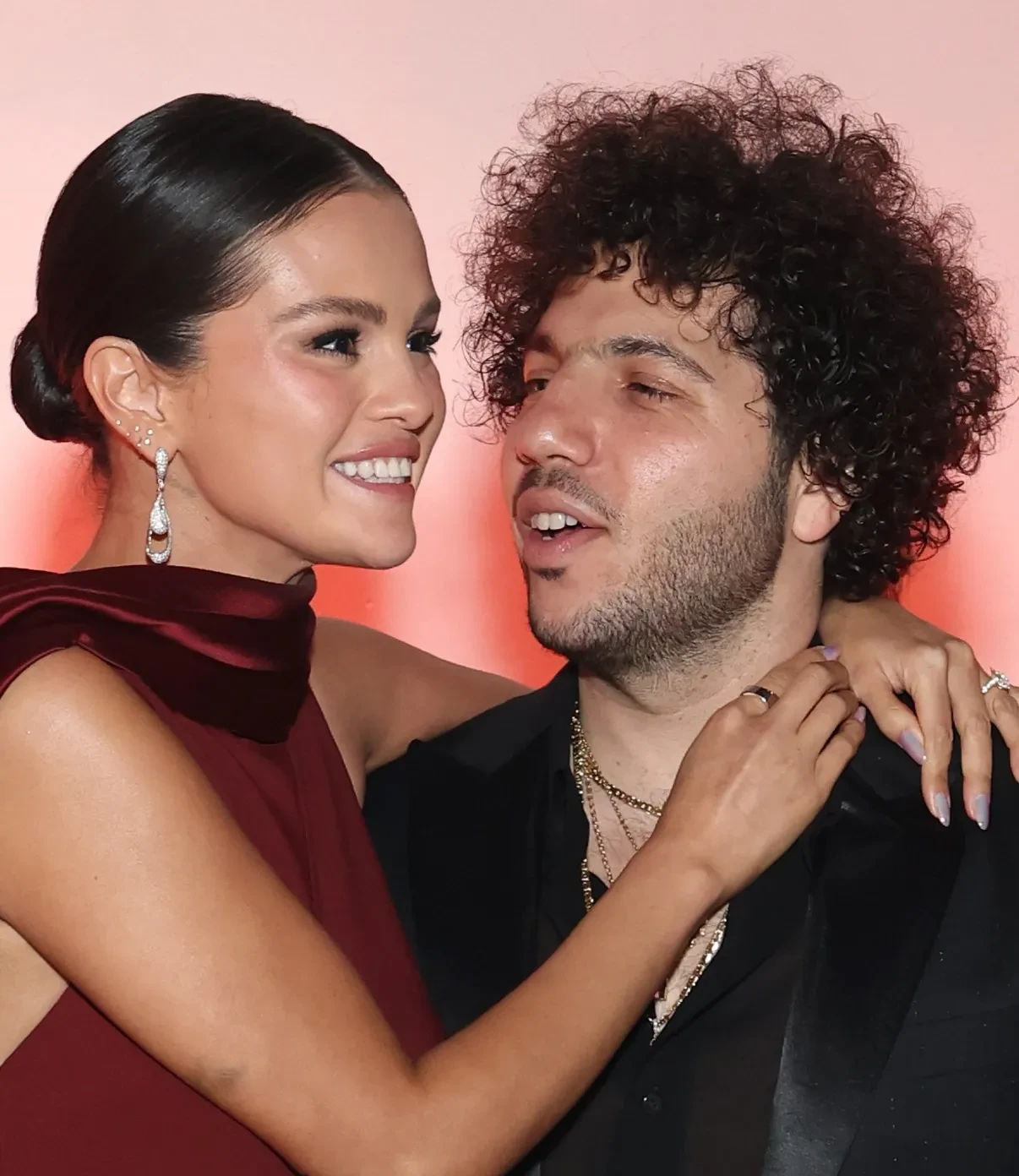 За вечер 33-летняя Селена сменила два образа. Она вышла на дорожку в сатиновом розовом мини-платье с накидкой и мюлями в тон, а после позировала с 37-летним мужем Бенни Бланко в бордовом платье.