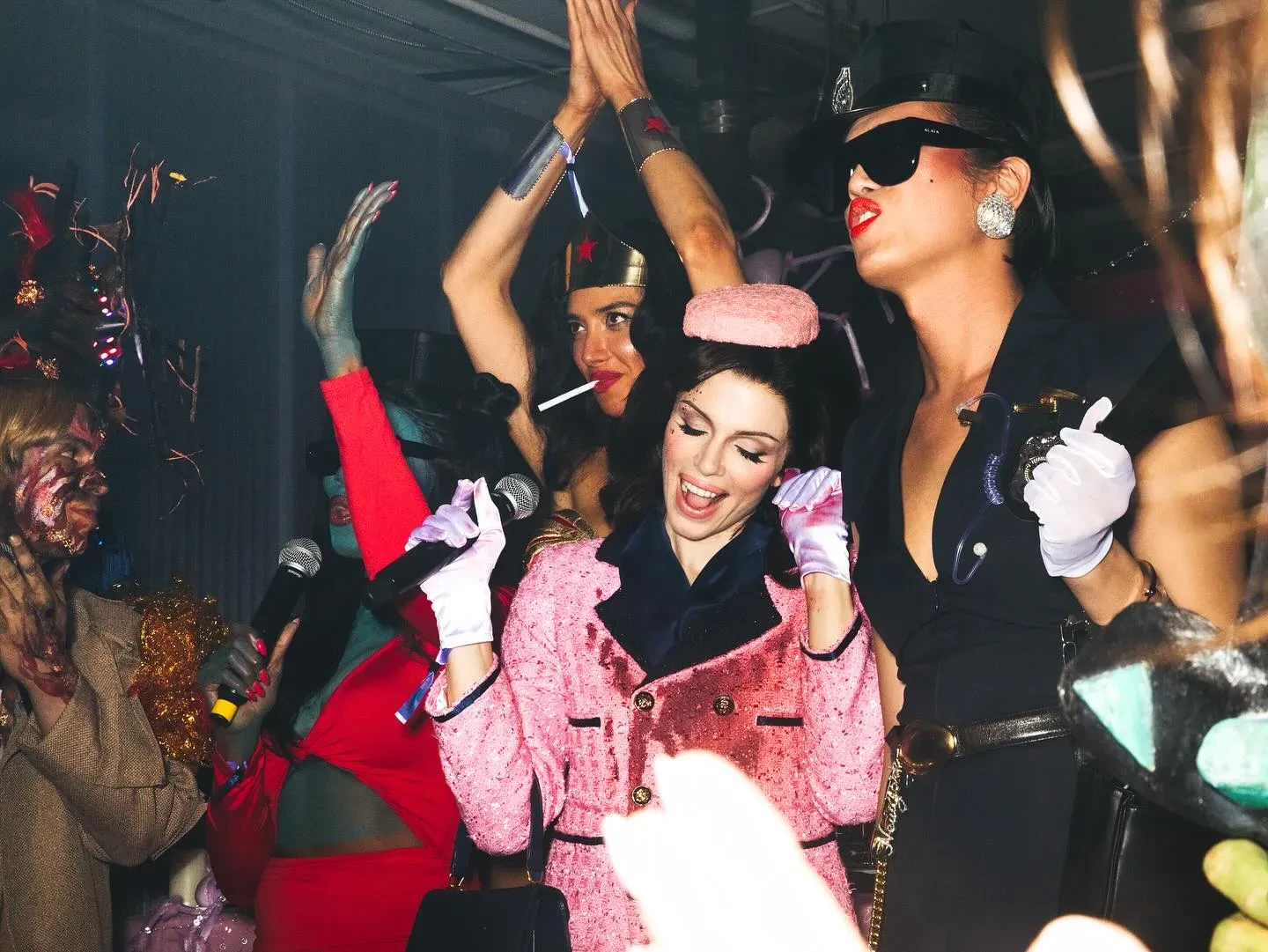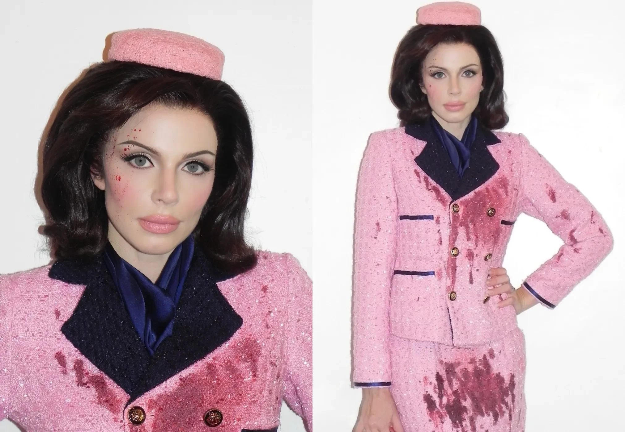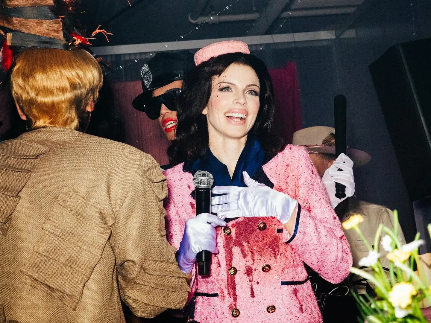 На Фокс был узнаваемый розовый костюм, состоящий из укороченного жакета и юбки-миди. Образ она дополнила шляпой-таблеткой и синими аксессуарами. Однако главной деталью стали красные брызги и подтёки, имитирующие кровь на лице и одежде.