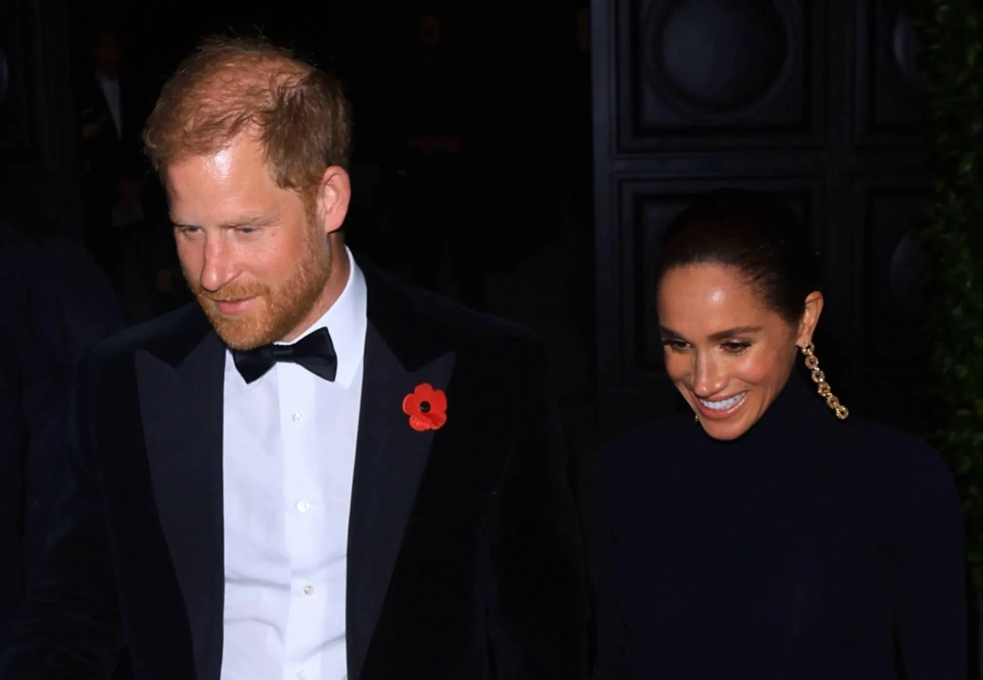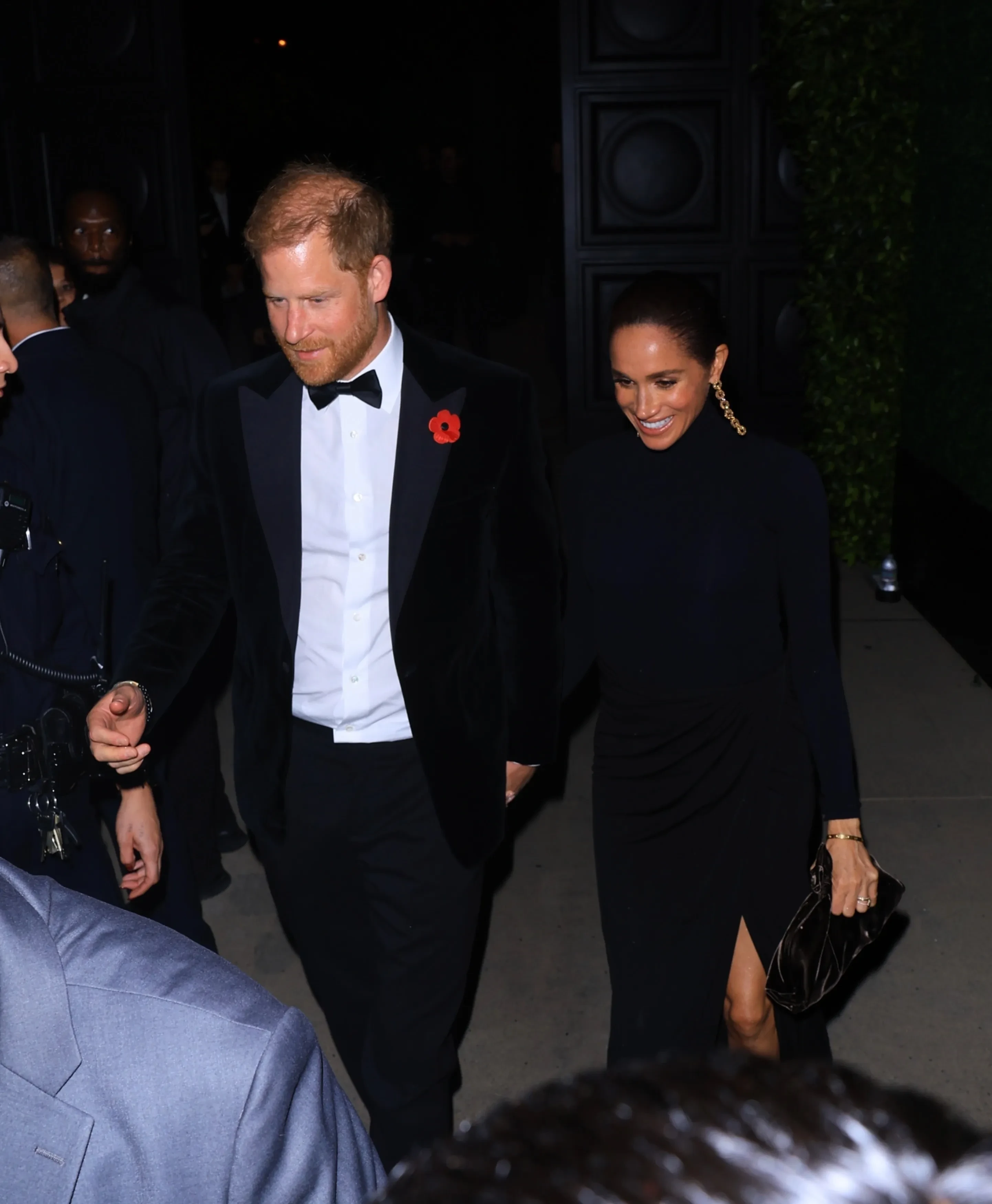 Герцогиня Сассекская выбрала для вечера чёрное длинное платье с высоким воротом и длинным разрезом на юбке, а её муж пришёл в чёрном костюме. Любопытная деталь: Гарри прикрепил к лацкану пиджака брошь в виде красного мака — символ Дня памяти, который сегодня отмечают в Великобритании.