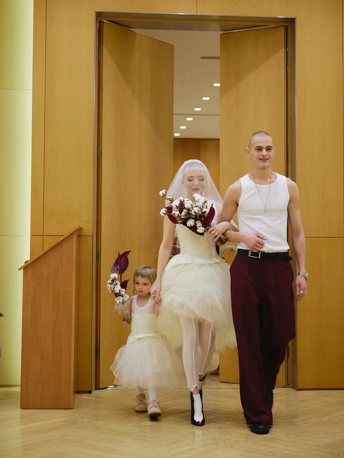Пара расписалась в Дворце бракосочетания № 1 Москвы в кругу друзей и близких. Образы влюблённых отличались от привычных нарядов новобрачных: Авдотья выбрала пышную юбку, корсет, надетый поверх майки-"алкоголички", и чёрно-белые ботильоны, а Даниил пришёл в такой же майке и свободных брюках винного оттенка. Александрову и её избранника сопровождала дочь Авдотьи от прошлых отношений, Алексия. Девочка оделась в том же стиле, что и мама, и держала в руках похожий букет.