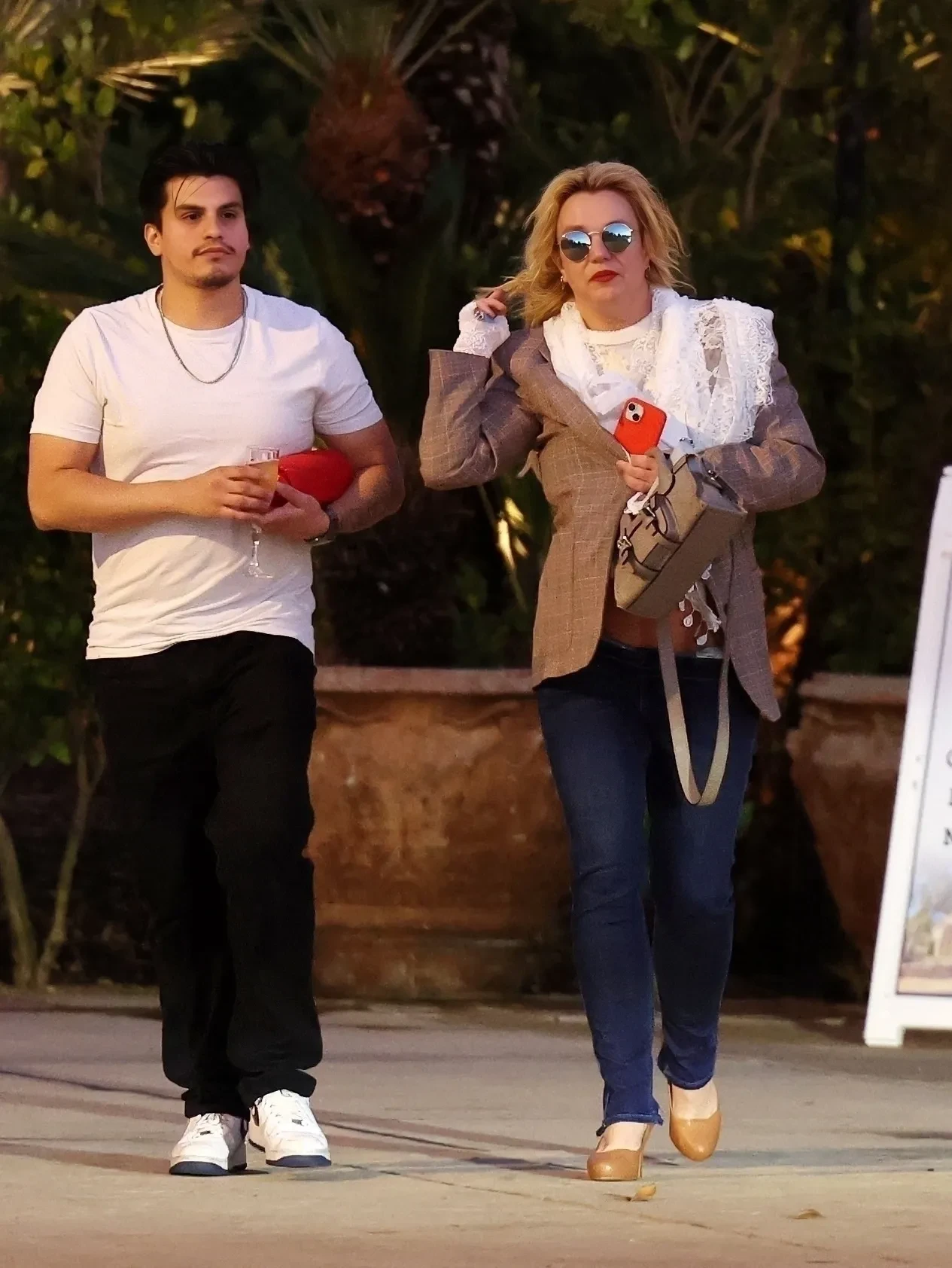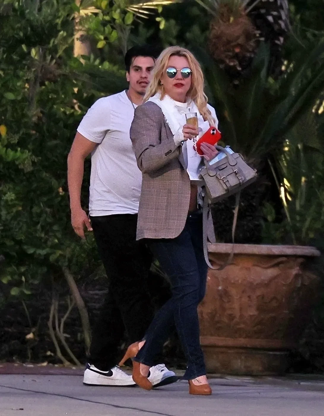 Спирс была одета в коричневый жакет с белой блузой, синие джинсы и туфли на каблуках, а образ дополнили солнцезащитные очки. Певица покинула ресторан в сопровождении сотрудника, который помог ей донести вещи до машины. После этого Бритни отдала ему бокал со своим напитком и уехала домой за рулём своего Mercedes.