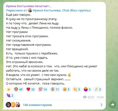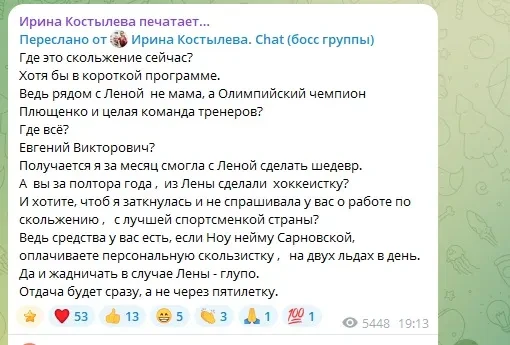 Скриншот из телеграм-канала Ирины КостылевойВ ответ Плющенко написал, что "долго молчал" (известно, что Ирина и прежде делала публичные нападки на тренера), и призвал не верить её словам. Он заявил, что тренерский штаб бережёт Елену на фоне травмы и рассказал о жёстких методах воспитания в семье Костылевых. Он также совершил демонстративный жест, подарив перед камерами Лене iPhone, чтобы она всегда "была с ним на связи" (ранее он заявил, что мать забирает телефон у дочери).