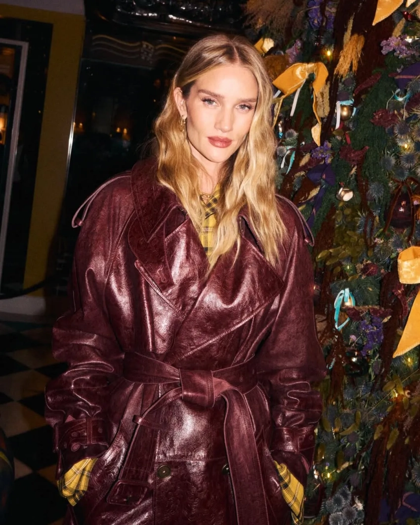 38-летняя Рози Хантингтон-Уайтли позировала на фоне дерева в тотал-луке Burberry — в бордовом кожаном плаще, брючном костюме и туфлях в фирменную клетку.