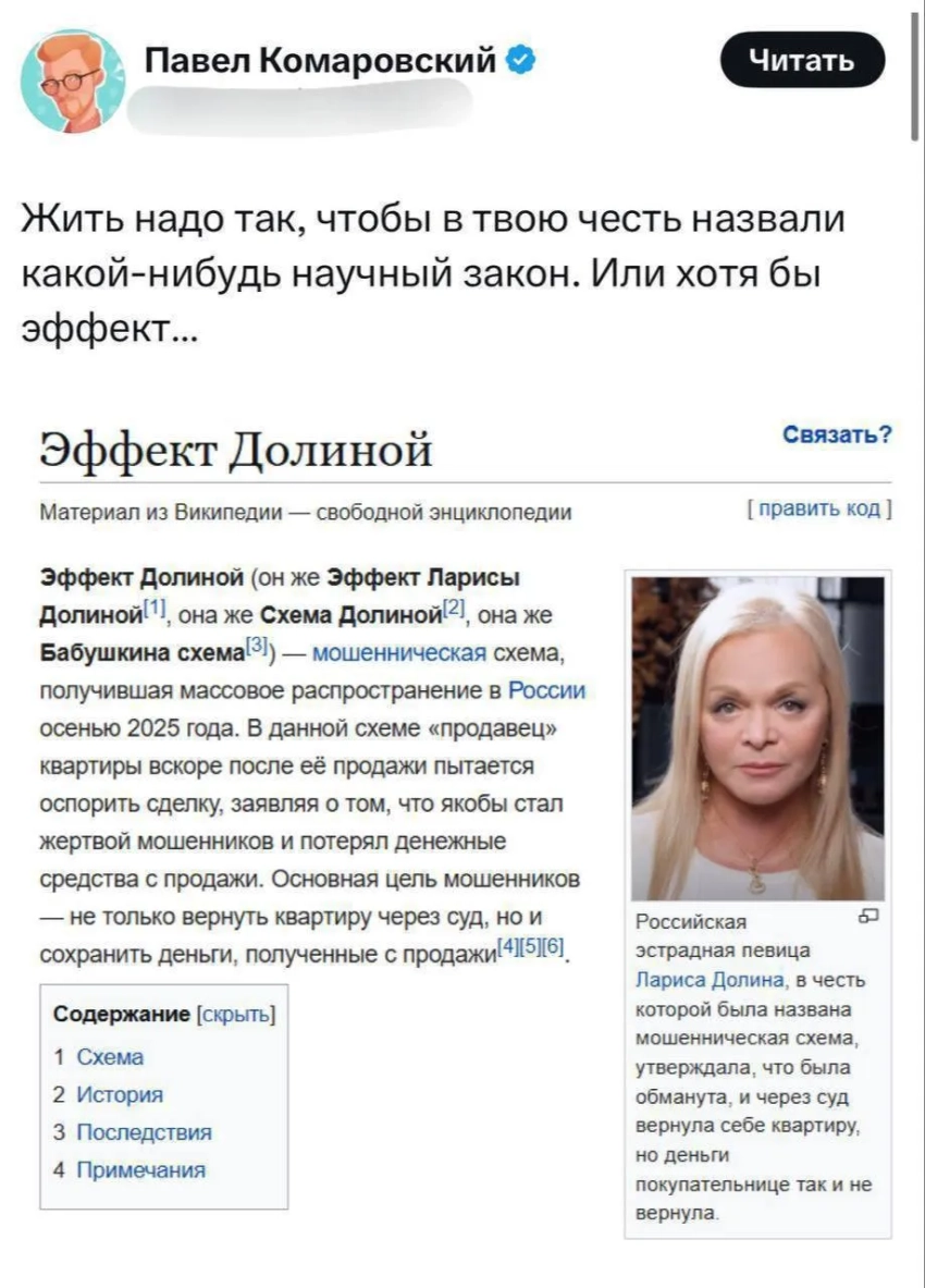Отдельно хейтеры возмущаются тем, что состоятельная артистка оставила покупательницу квартиры, москвичку Полину Лурье (которая не знала о мошеннической схеме), без денег. "Долина заработает на новогодних выступлениях стоимость своей пятикомнатной квартиры, на которую её развели мошенники. Поделится ли она этими деньгами с оставшейся ни с чем покупательницей её жилья?" — спрашивают в телеграм-канале Baza.