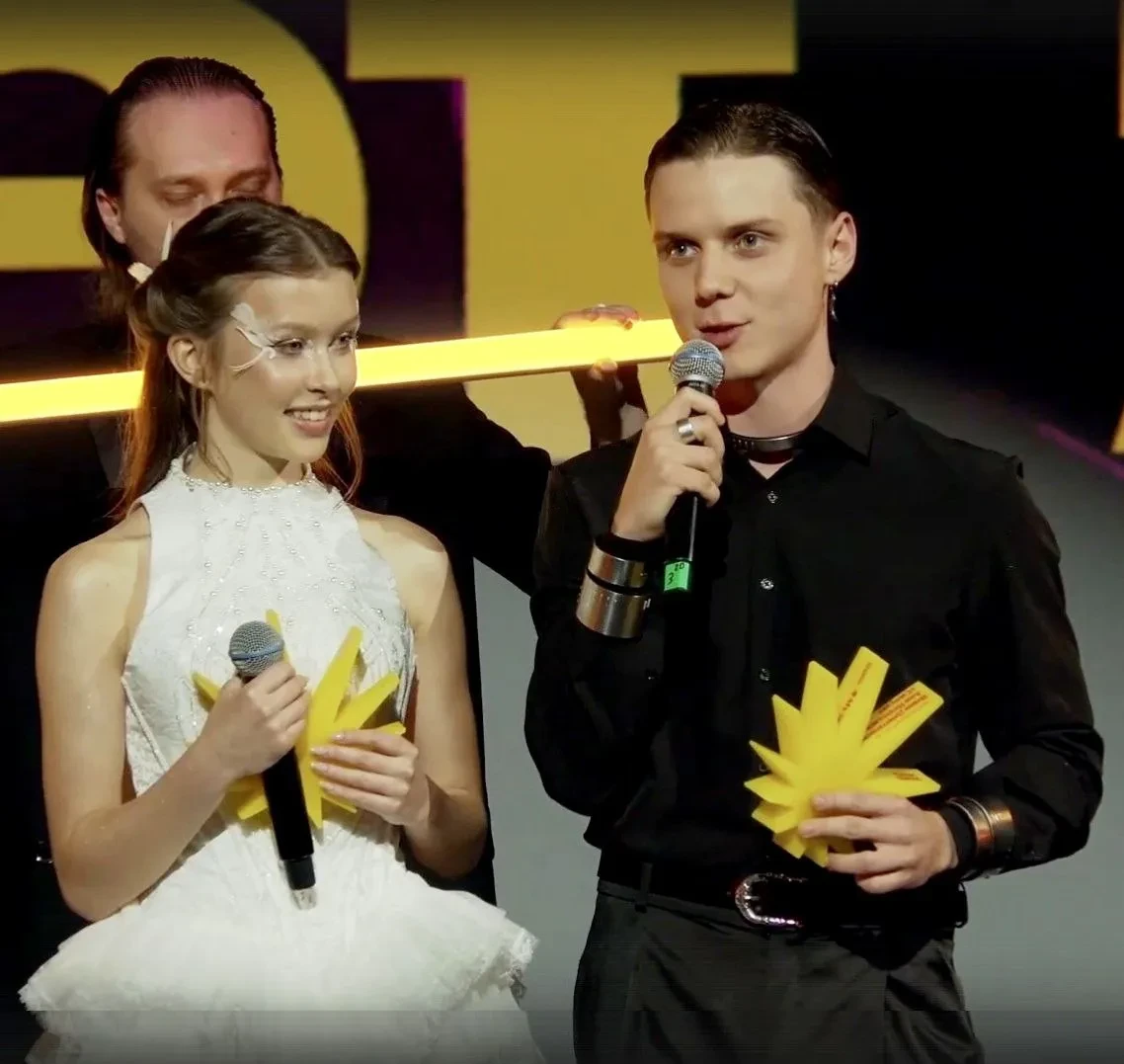 16-летняя актриса вышла под камеры в коротком белом "платье невесты" и с декоративными крылышками за спиной. Её возлюбленный на контрасте был одет в total black. Пара исполнила со сцены свой хит "Силуэт".
