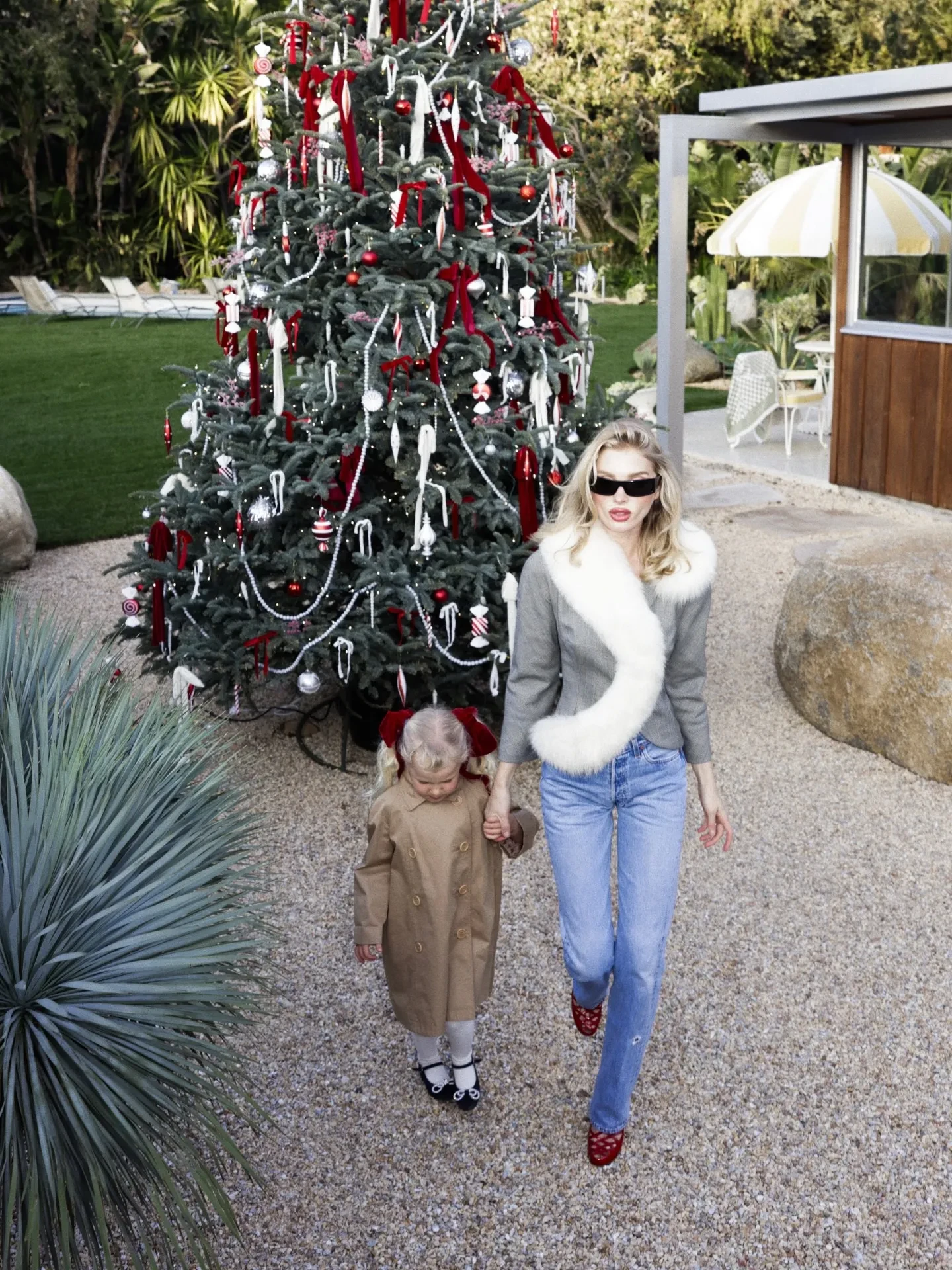 Съёмка прошла в саду загородного дома семьи, украшенного праздничной елью. Для фотосессии Эльза выбрала серый приталенный жакет с меховыми вставками, прямые джинсы и красные босоножки. Четырёхлетняя Тууликка была одета в песочный плащ, а её образ завершали хвостики с красными бархатными бантами. "Счастливого Рождества!", — подписала модель публикацию.