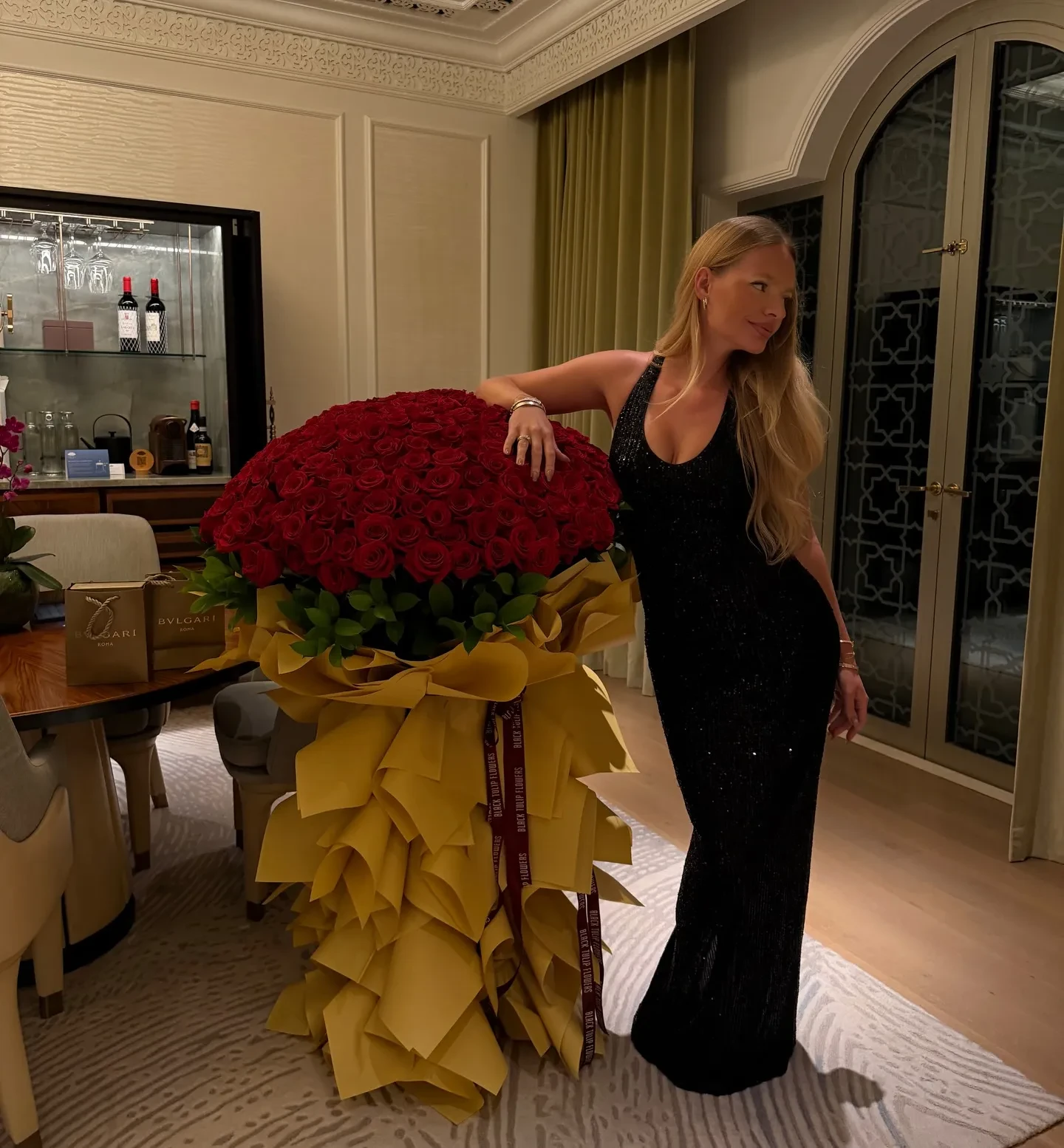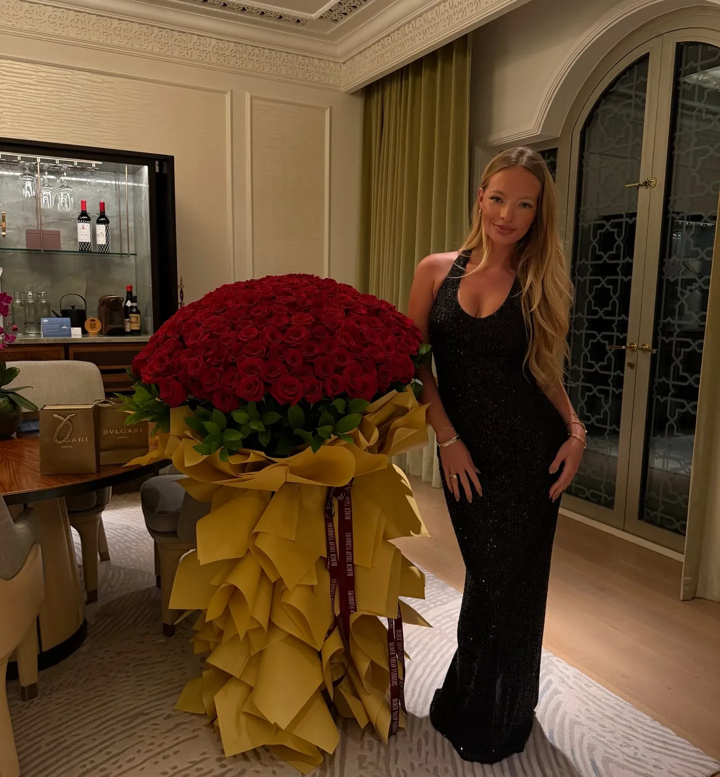 Вечернее платье с декольте, букет красных роз и украшения Bvlgari в подарок: Елизавета Пескова отметила 28-летие в Абу-Даби