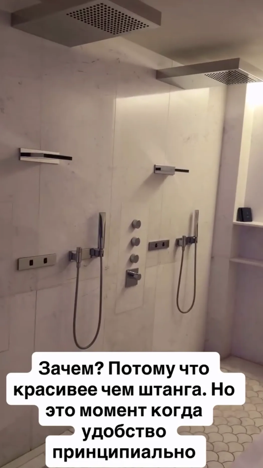Скриншот из сторис* Ксении СобчакВ душевой зоне Ксении не понравилось то, что она общая — для женщин и мужчин (один из них даже попал к ней в кадр), а само пространство для принятия душа рассчитано на двух человек и не имеет перегородки. Там есть несколько вариантов леек, но нет самой обычной, к которой все привыкли. Ксения показала ещё одну отдельную душевую с тропическим душем, который она назвала "дико неудобной хренью" — там тоже нет привычной для неё лейки. "148 вариантов душа — сверху, отсюда, ещё какие-нибудь струи, но ни одного нормального полноценного душа", — заметила Собчак.