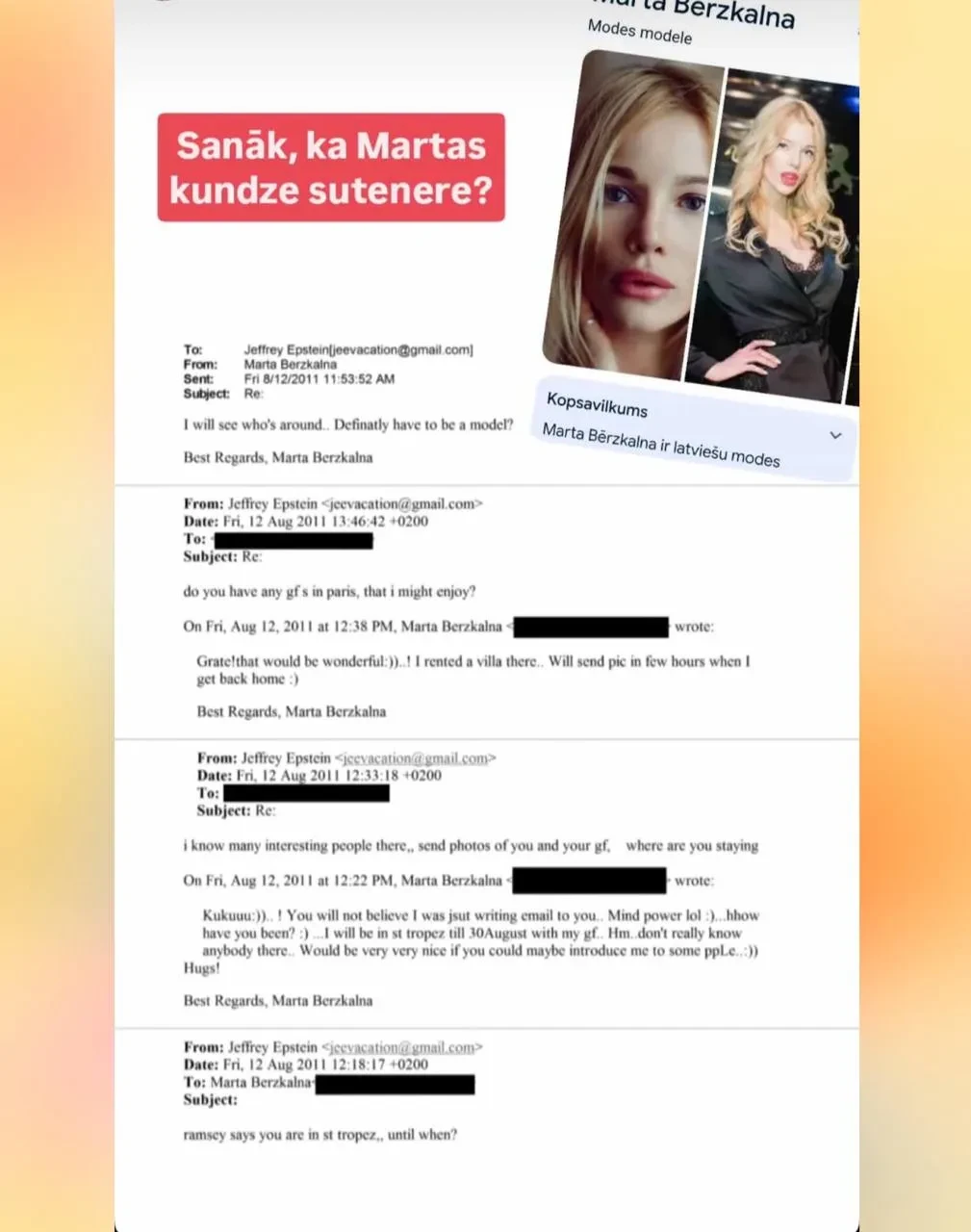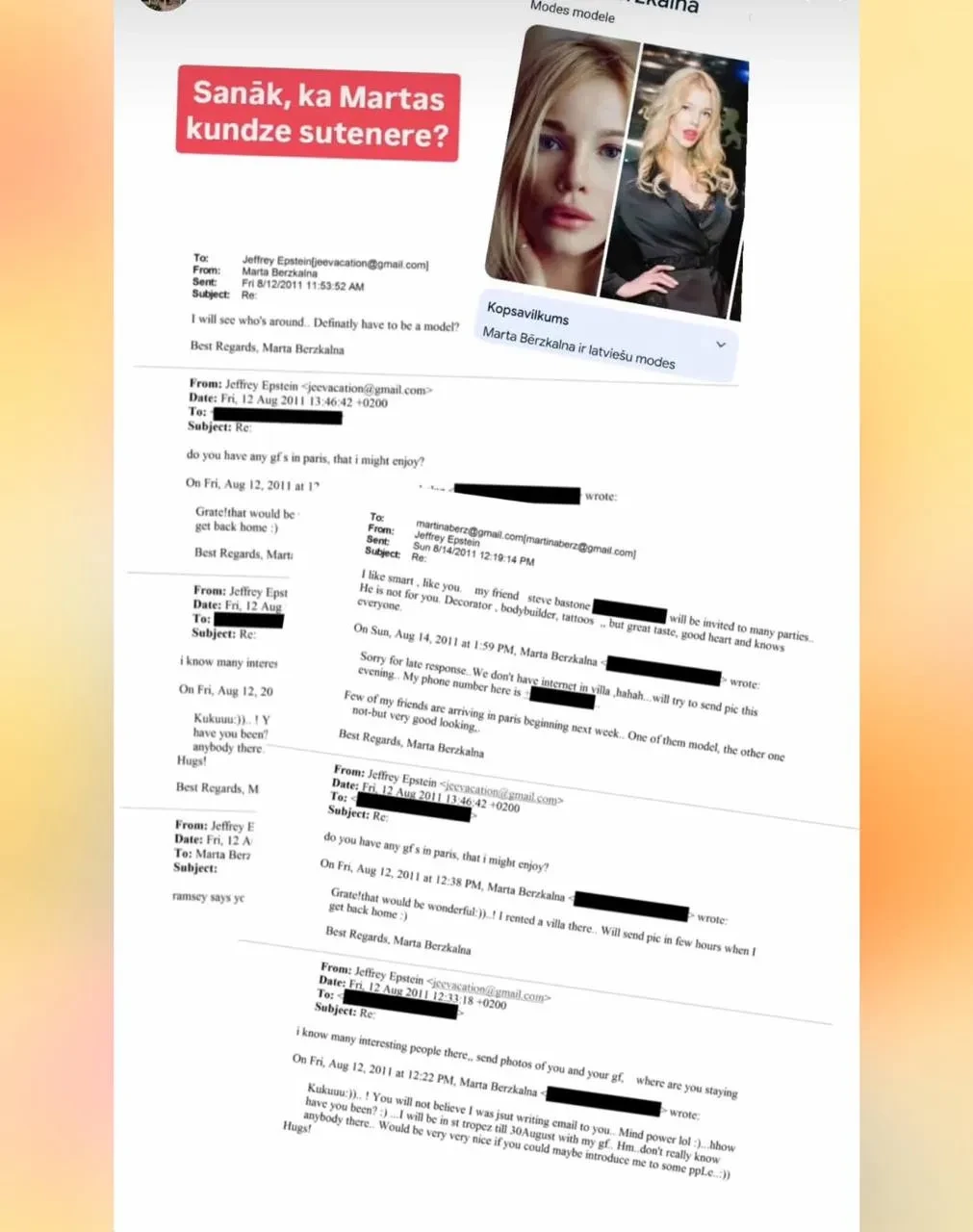 Согласно документам, в августе 2011 года Берзкална переписывалась с Эпштейном, сообщает в своём телеграм-канале Юния Пугачёва. Миллиардер спрашивал у модели, нет ли у неё для него девушек в Париже. На что Марта уточняла, обязательно ли ему нужны модели и познакомит ли он её с "интересными людьми". Далее в переписке Эпштейн отметил, что ему нравятся "такие же умные, как Марта" и что в компании с ним будет некий Стив Бомон — декоратор и бодибилдер "с большим сердцем и хорошими связями".