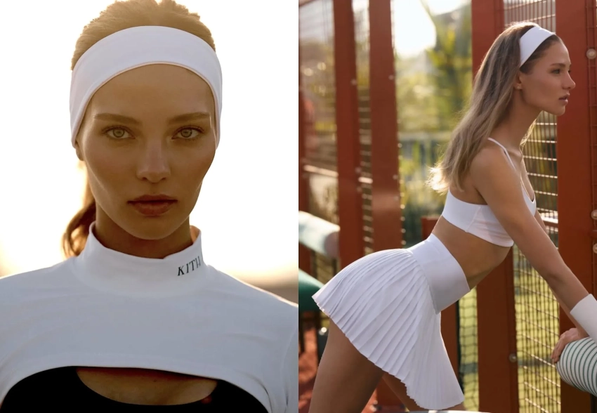 Кафельникова примерила плиссированную юбку, зелёную олимпийку, микрошорты с топом, короткий белый лонгслив и белое спортивное платье. Образы дополнили повязка на голову, козырёк и часы.