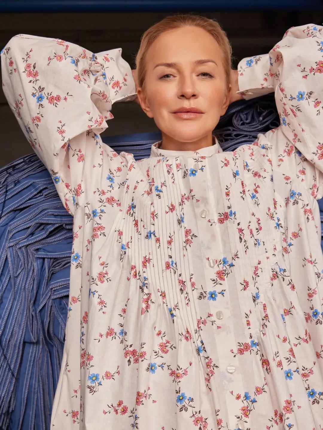 Шелягова примерила фартуки, платья и сарафаны с уникальными принтами, которые были специально отобраны и воссозданы художниками Шуйской фабрики по архивным образцам XVIII—XIX веков и перенесены на современный ситец.