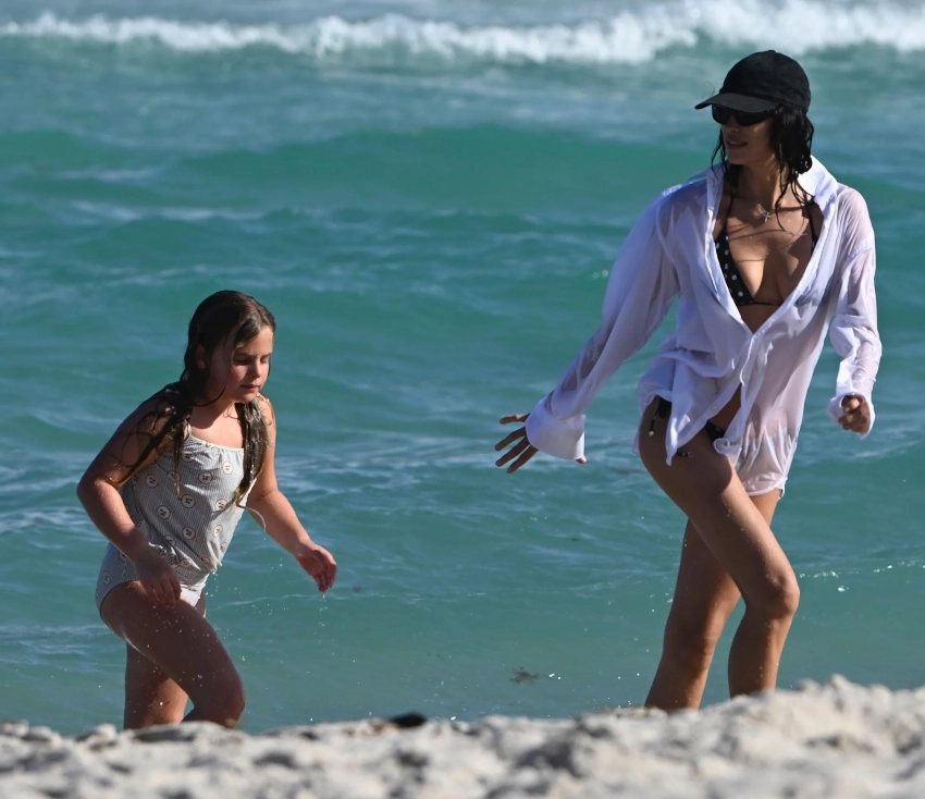Ирину Шейк в бикини и мокрой рубашке засняли на пляже с дочерью
