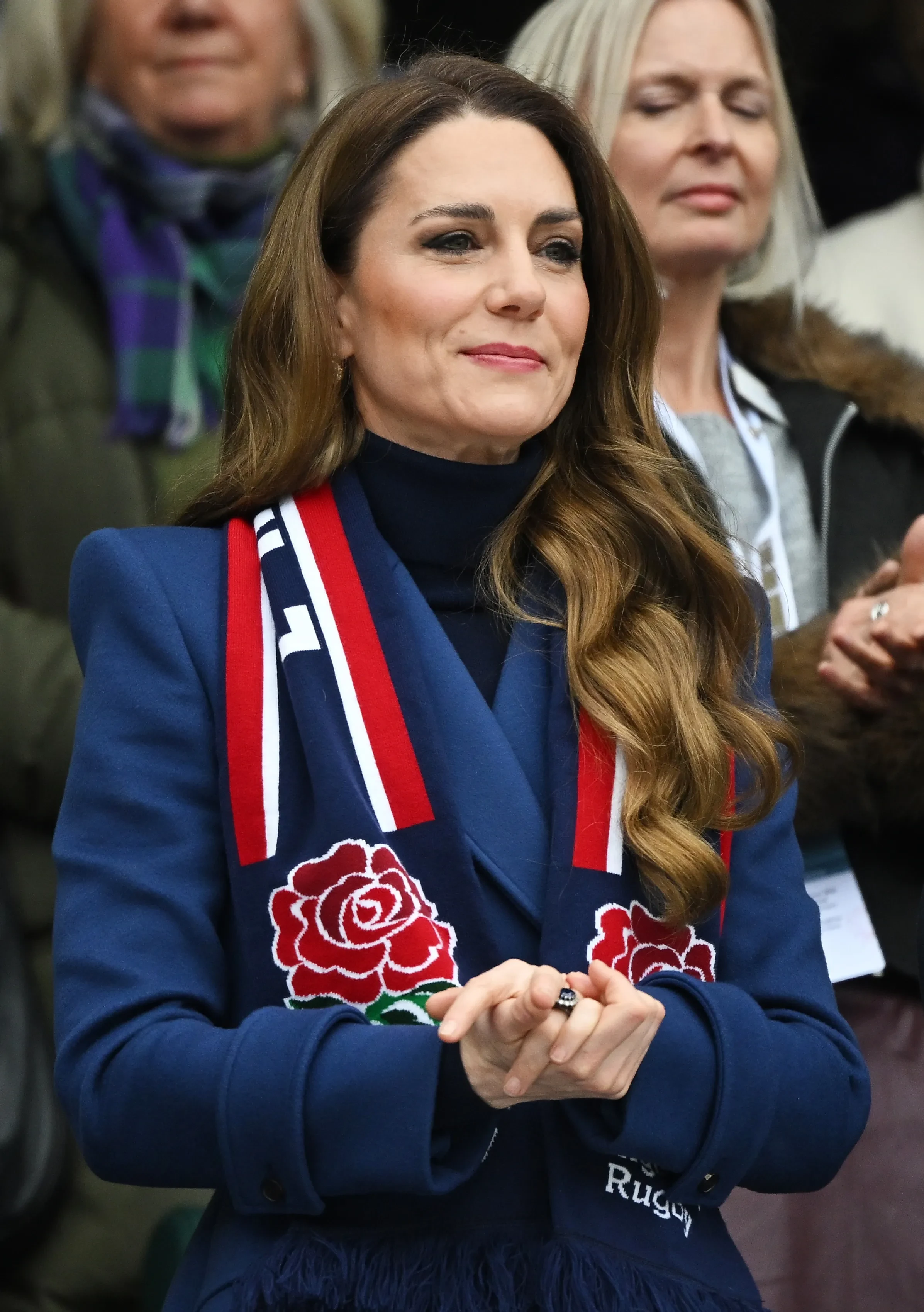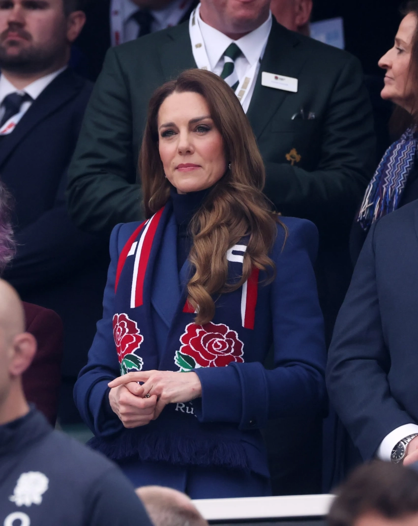Принцесса Уэльская пришла на игру без мужа принца Уильяма и в своём любимом двубортном пальто синего цвета от Alexander McQueen, которое она уже надевала не один раз. Кейт Миддлтон дополнила образ кожаными перчатками и шарфом с большими красными розами — логотипом английской команды.